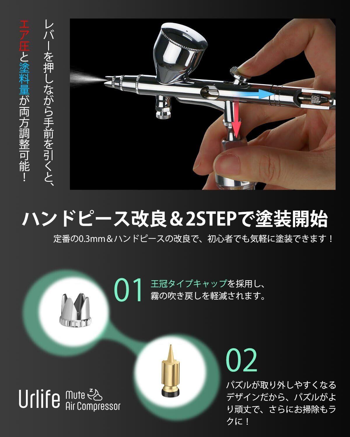 urlife Umute エアブラシ コンプレッサー 静音 ミニコンプレッサー 3段階エア圧制御 軽量 小型 ダブルアクション 口径0.3mm エアコンプレッサー エアーブラシ プラモデル 長時間塗装