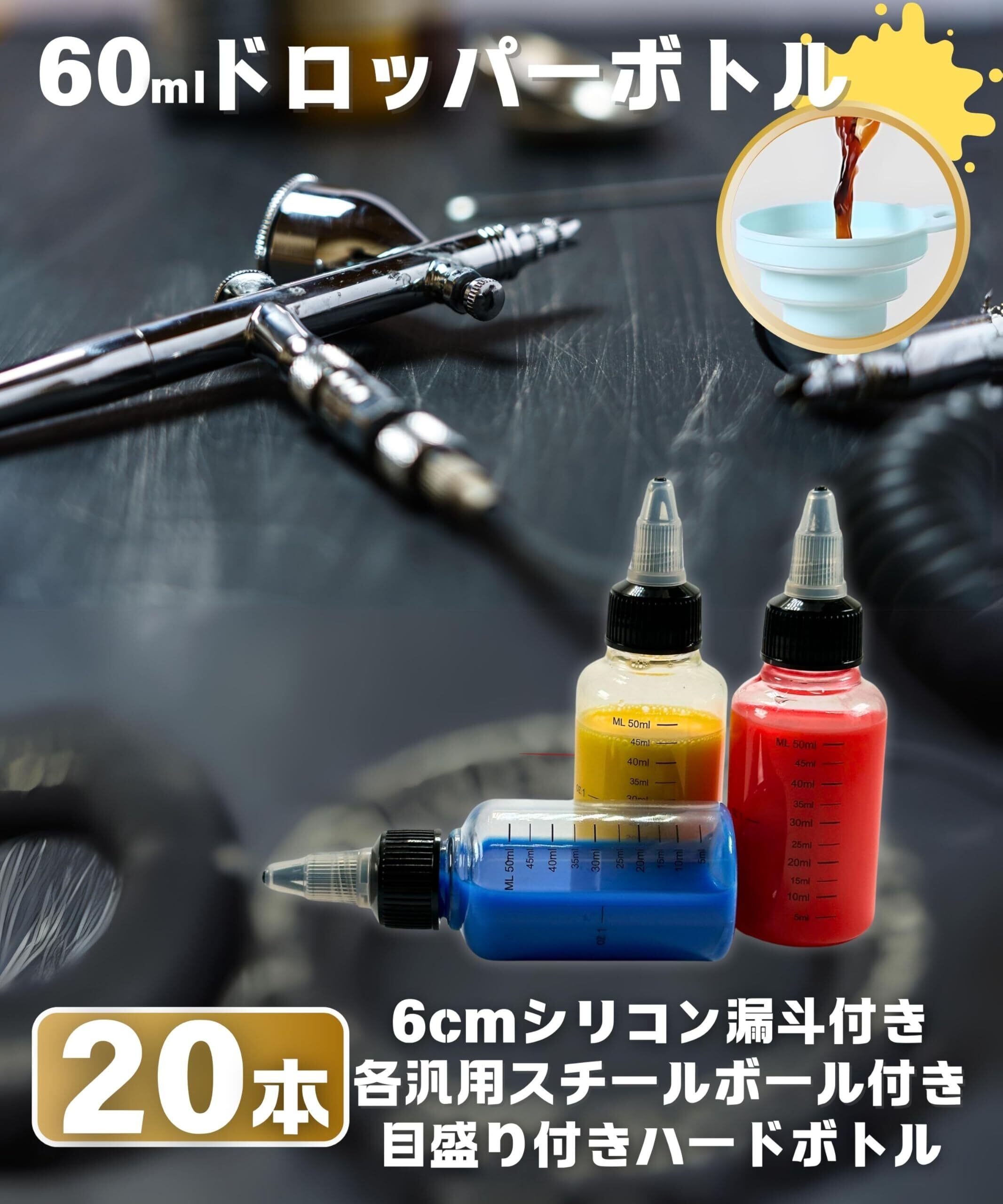 5 colori ドロッパーボトル 20個セット 50ml 目盛り付き ツイストキャップ 撹拌スチールボール シリコン漏斗付き クリア プラモデル 塗料 小分け用 スポイト (60mlハード)