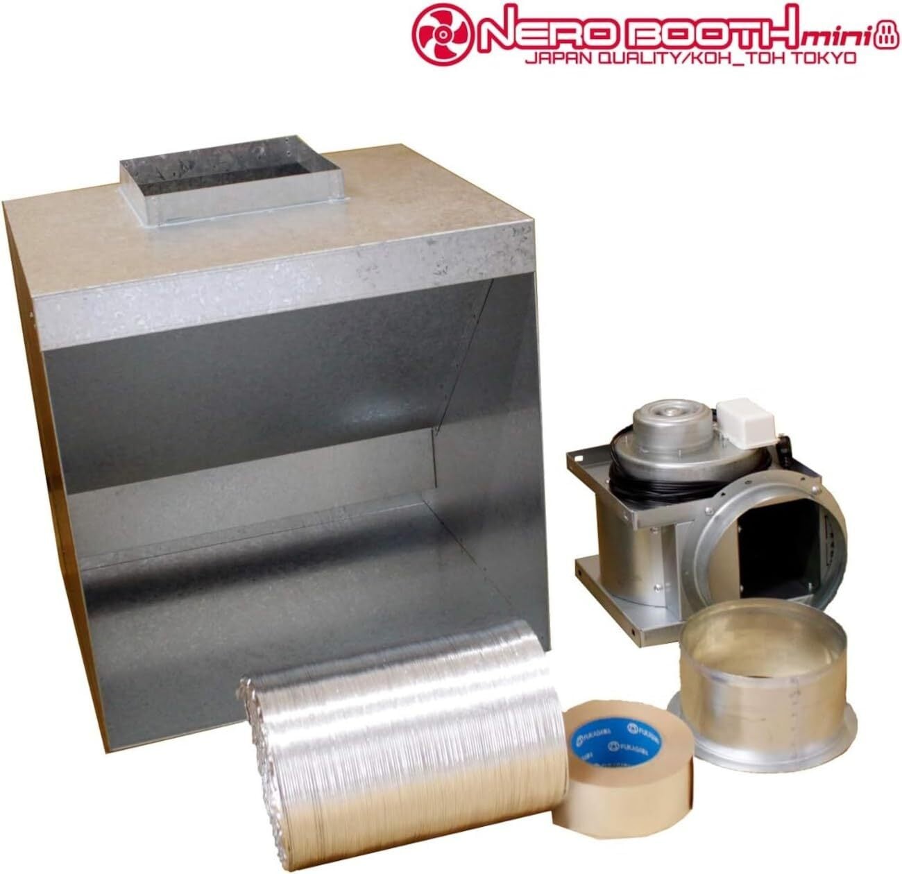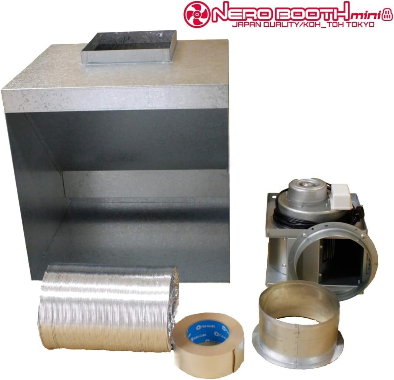 セット内容:1.ネロブースmini本体 / 2.シロッコファン / 3.定着カラー / 4.ワイヤーアルミフレキシブルダクト(150mm径×2m) / 5.アルミテープ / 6.マグネットステッカー