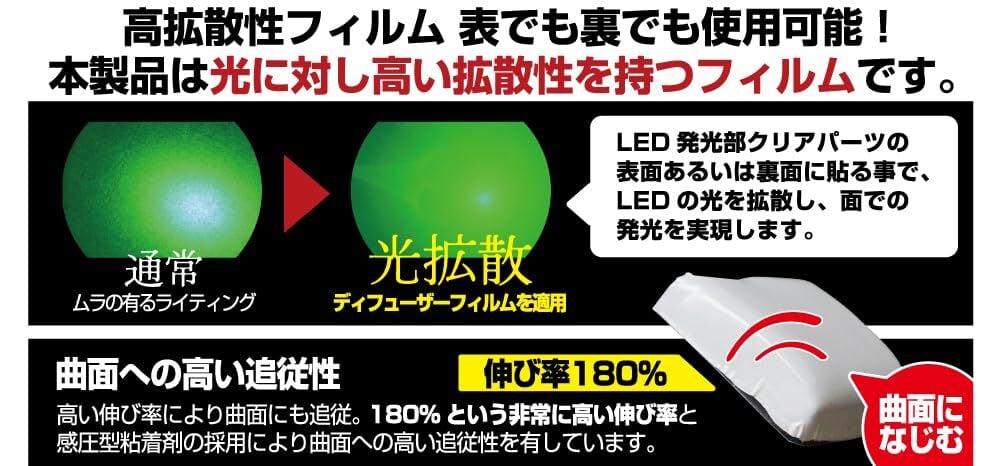 製品の用途例 面発光が必要な時に。ミニチュア看板の製作に。 未塗装でもクリア面に貼るだけで拡散効果を実現します! 製品の特徴 高拡散性フィルム 表でも裏でも使えます!! 本製品は光に対し高い拡散性を持つフィルムです。LED発光部のクリアパーツ表面、 あるいは裏面に貼ることで LEDの光を拡散、面での発光を実現します。 高い伸び率により曲面にも追従 180%という非常に高い伸び率と感圧型粘着剤の採用により曲面への高い追従性を有しています。 別途エンハンスメント・フィルム(MMEHS)と組み合わせることで、端部まで均一な明るさを保つことが可能です。