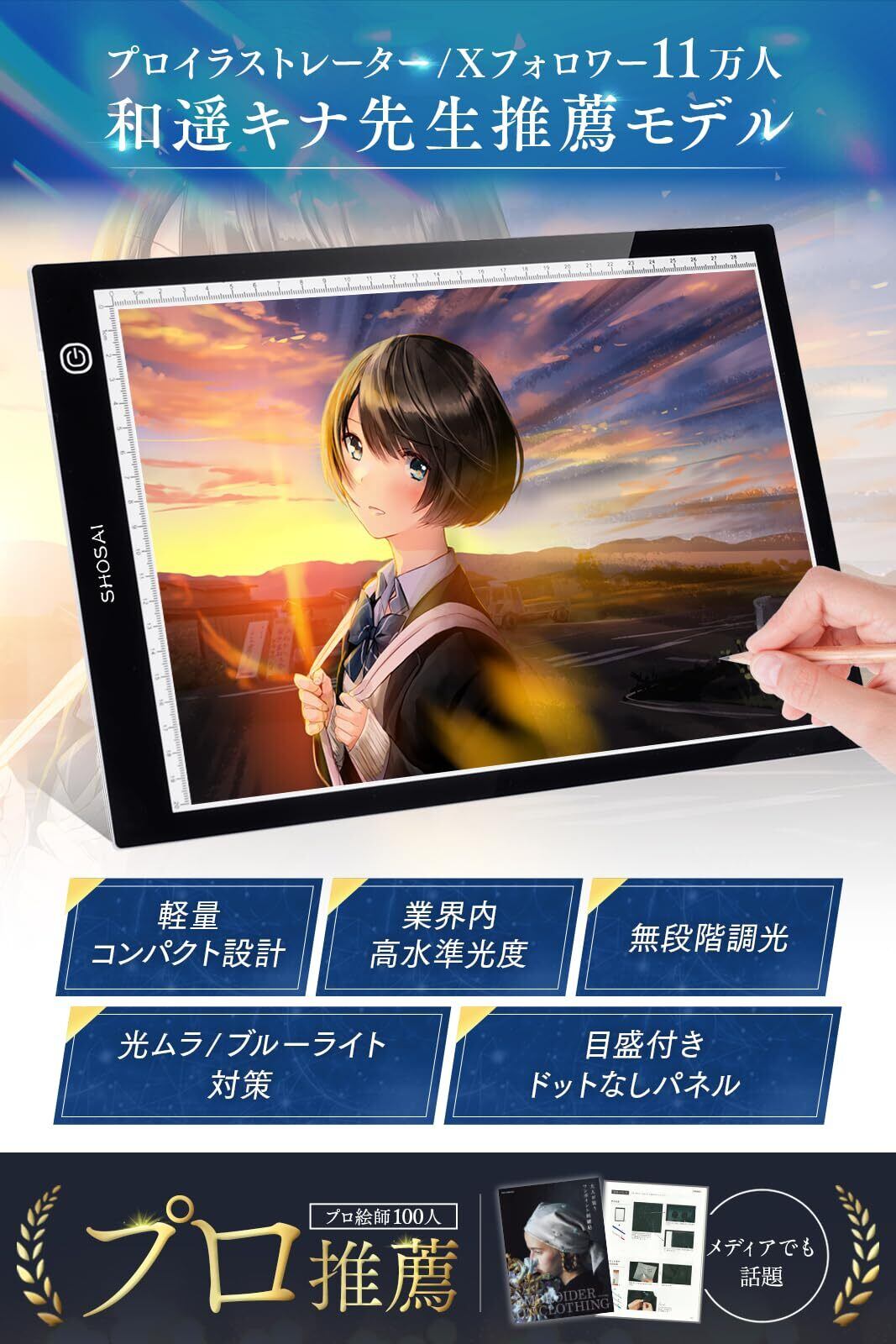 【プロ推薦の高品質モデル】 LEDライト を多く搭載し 高輝度 を実現。 ドットなしの 高品質パネル による全面発光で、均等な明るさとちらつきを軽減した快適な作業環境を提供します■ボタンの長押しで 無段階調整 ができ、タッチ感度も良好ですので ストレス なく調節できます。トレース用紙の厚さに応じて明度調整するのがおすすめです。