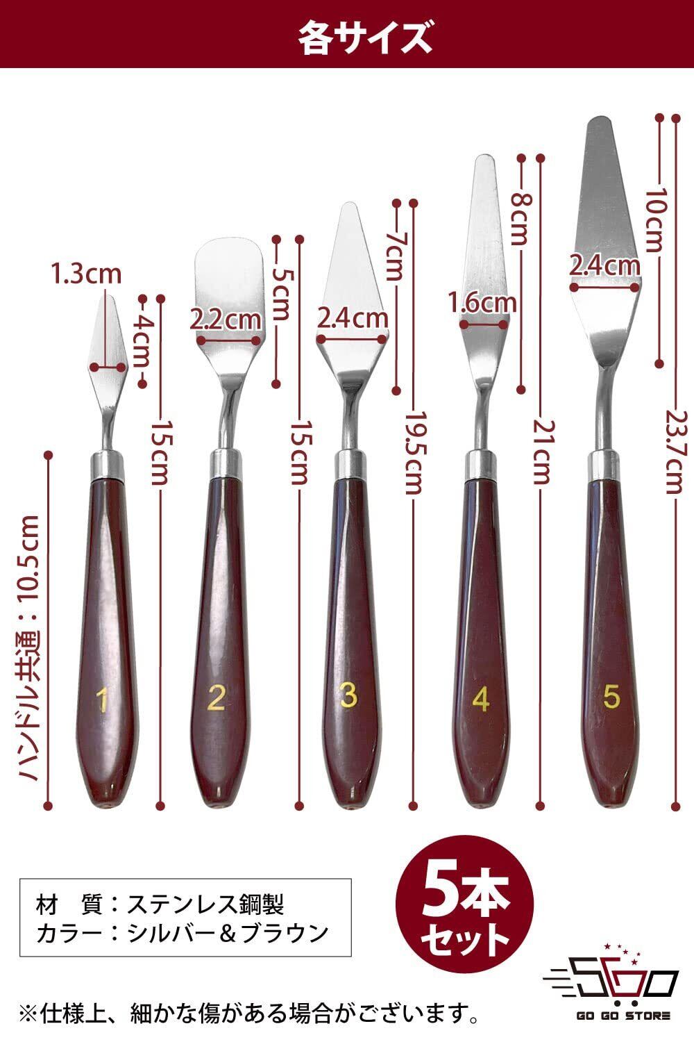 2【 5種類の豊富なセット!使い分け可能◎ 】 本製品は、5つのタイプのパレットナイフのセットとなっております。鋭い先端のものや丸く平たいものなどそれぞれ形状とサイズが異なり、作品やデザインに合わせて使い分けていただくとクオリティの高い作品に仕上がるでしょう 【 商品仕様 】 ●「セット内容」5個セット※仕様上、細かな傷がある場合がございます。 ●「材質」ステンレス鋼製 ●「カラー」シルバー&ブラウン
