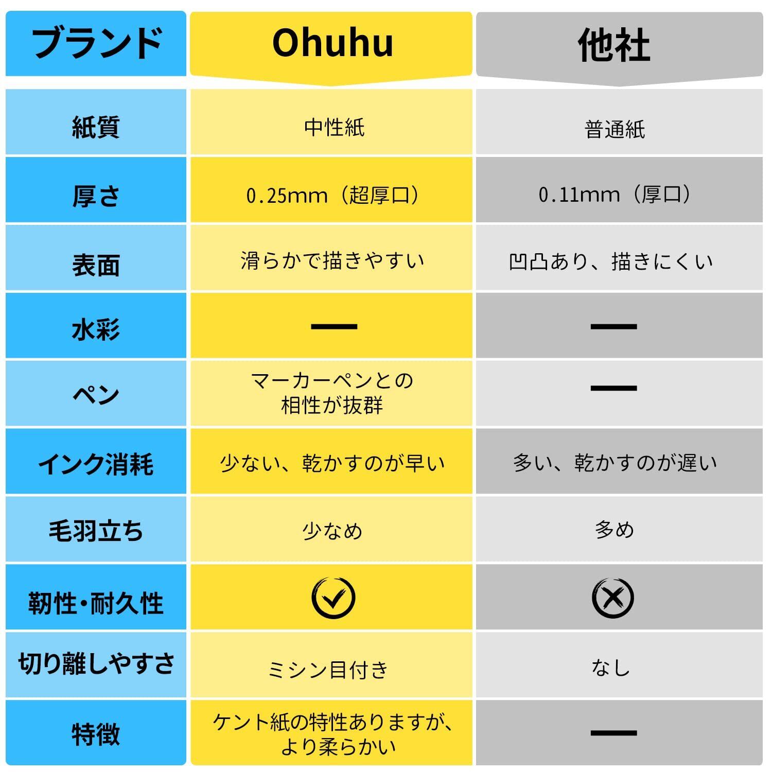 ️【ツルツル・厚紙】:200gsm(0.25mm)超厚口。表面が凹凸がなくツルツルしている画用紙としては、スケッチ、マンガ、製図、デザインを描かれる方におすすめ!特にOhuhuアートマーカーペンとの相性が抜群です。インクの乗りも良くてグラデーションやかすれの効果などを活かすことができますし、快適な使い心地を実感していただけます。