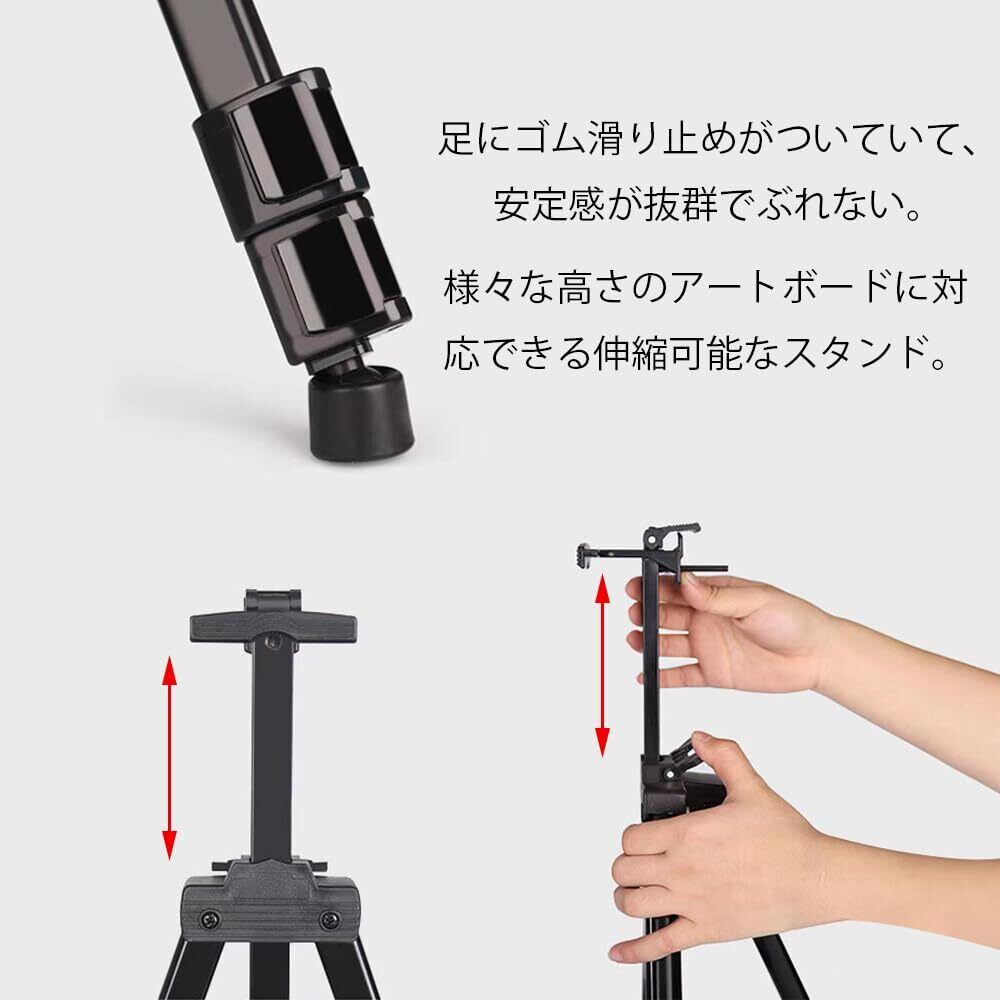 【自由に高さ調整可能】最大155cmまで調整可能で、収納時は51cmとコンパクト。三段階に伸縮し、絵やボードに合わせて自在に調整可能。立って描くもよし、座って描くもよし。身長制限なしで大人も子供も利用可能な折りたたみ式イーゼルスタンド。
