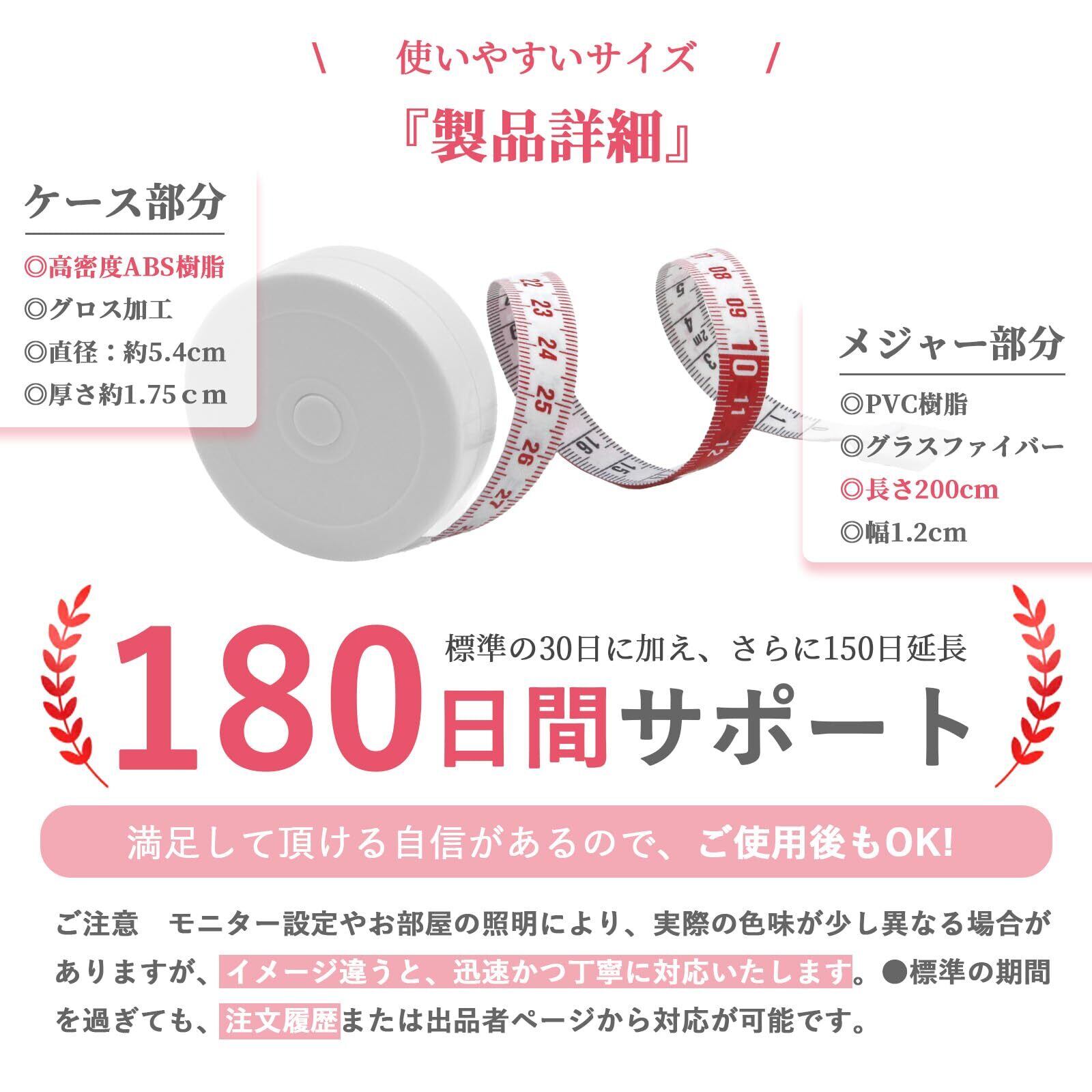 【3色展開・高密度素材】ホワイト、ブラック、ピンクの3色から選べます。【素材】メジャー:PVC樹脂+グラスファイバー、ケース:高密度ABS樹脂 【サイズ】メジャー:長さ200cm・幅12mm、ケース:約直径5.4cm・厚さ1.8cm