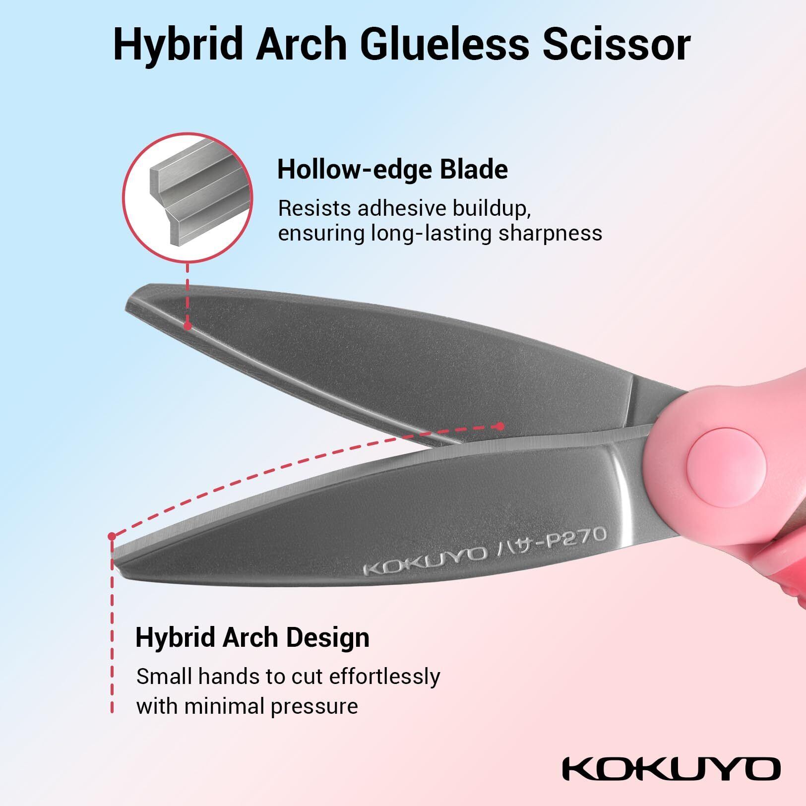 特殊なアーチ曲線のグルーレス刃で、小さな力で刃先まで軽く切れ、粘着テープなどを切ってものりがつきにくい学習はさみ。工作にも最適です。