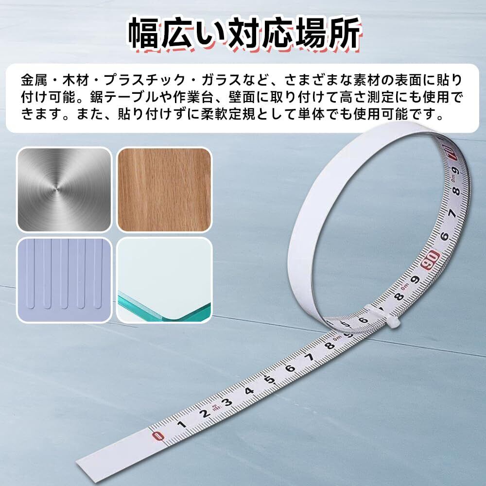 【幅広い対応場所】金属・木材・プラスチック・ガラスなど、さまざまな素材の表面に貼り付け可能。鋸テーブルや作業台、壁面に取り付けて高さ測定にも使用できます。また、貼り付けずに柔軟定規として単体でも使用可能です。