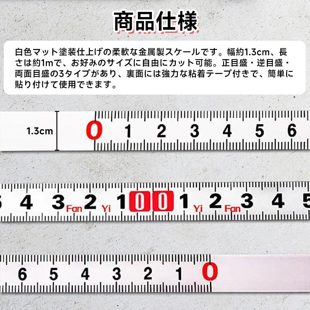 【商品仕様】白色マット塗装仕上げの柔軟な金属製スケールです。幅約1.3cm、長さは約1mで、お好みのサイズに自由にカット可能。正目盛・逆目盛・両面目盛の3タイプがあり、裏面には強力な粘着テープ付きで、簡単に貼り付けて使用できます。