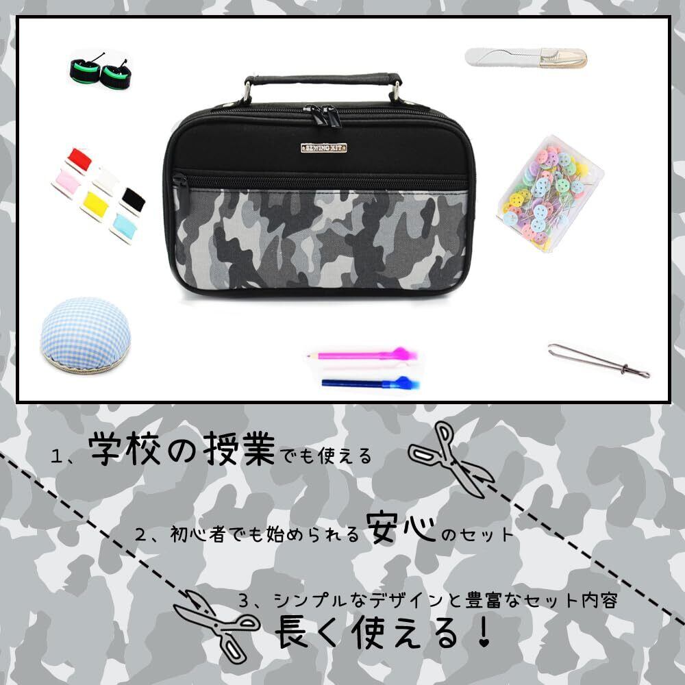 裁縫セット 初心者向け ソーイングキット コンパクト収納ポーチ付き 学校 家庭用 携帯便利 男女兼用 モノトーン迷彩柄 (ホワイト)