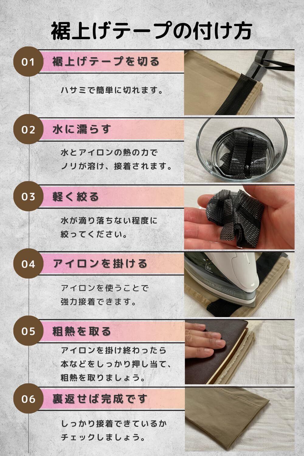 ・【簡単に使えるガイドブック付】写真付きのガイドブックが同梱されており、具体的な使い方をマネするだけで、誰でも簡単に美しい裾上げが実現できます!手順が明確なので、初心者でも安心です。