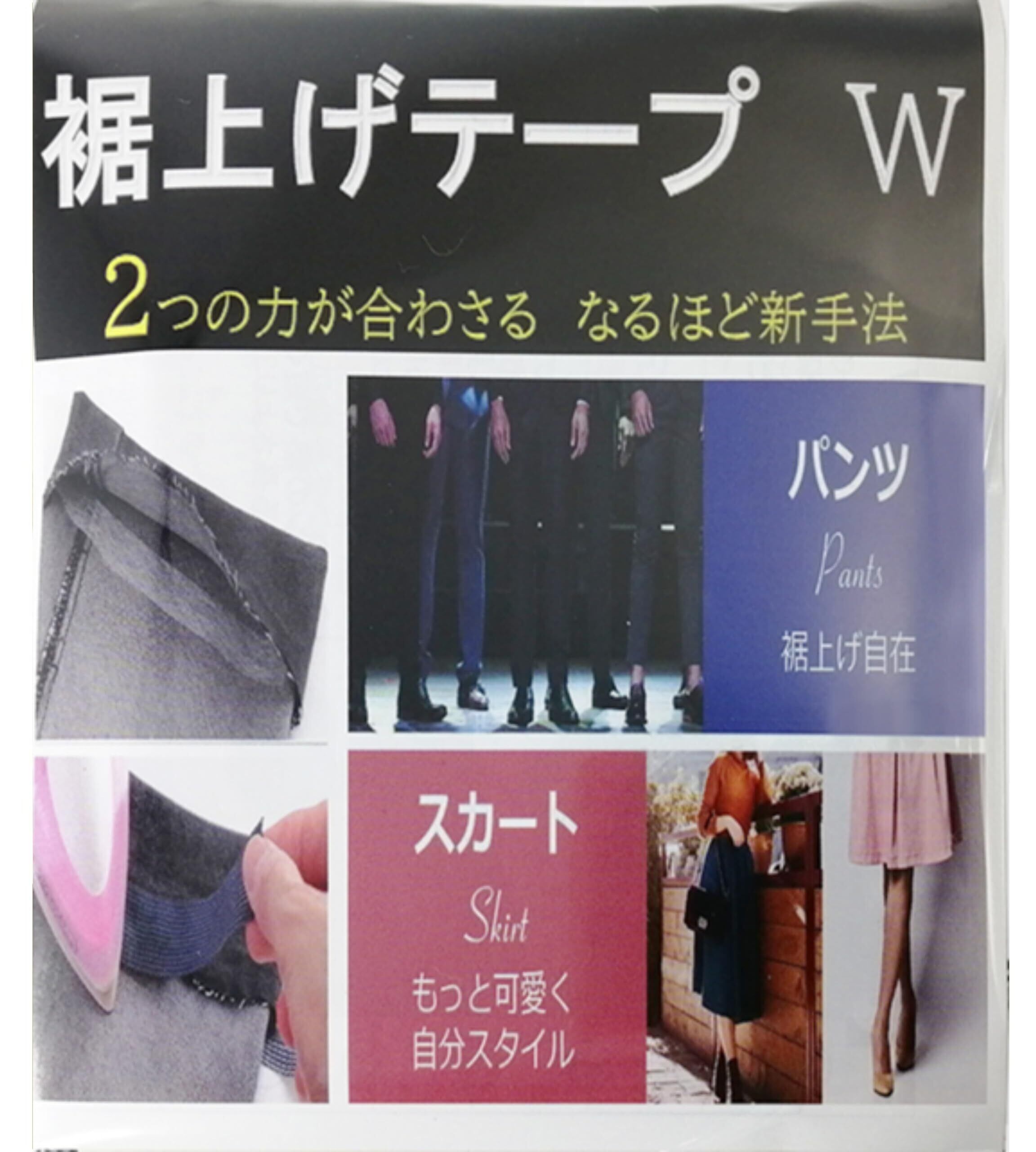 [糸も針も不要]裾上げテープWは、洋裁が苦手な人や忙しい人に便利。洗濯機やドライクリーニングにも対応。ダブル使用で強度が高く、様々な用途に使用可能。裾上げテープの接着力に不満の方におすすめ。