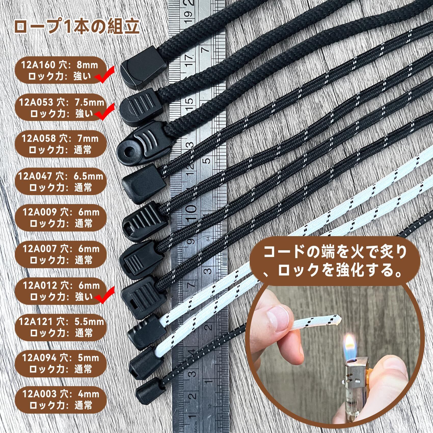 【仕様】12点セット、選べるサイズ、直径約 2mm 2.5mm 3mm 3.5mm 4mmのロープ用。注:ロープの柔らかさと硬さが違うため、ピッタリすぎて少し紐が太いと工夫が必要。