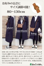 サイズ調節可能! お使い頂く方の背丈や使いやすさに合わせて約80㎝~130㎝まで長さに調節できるように設計しております。ショルダーバッグは使い勝手もよくて重宝しますが、掛け方ひとつ、長さひとつで印象がガラッと変わります。ショルダーバッグをオシャレに魅せるには長さがとても重要なポイントです!ぜひ、本製品を活用してオシャレをお楽しみください。