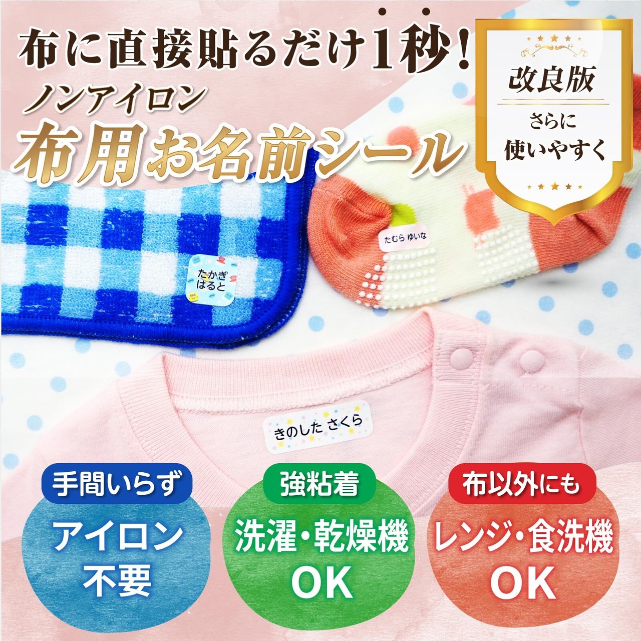 【強粘着】忙しいママの声を元に研究開発された、アイロンなしで布に貼るだけのお名前シール忙しい朝でもペタッと貼るだけでお名前付けが完了します