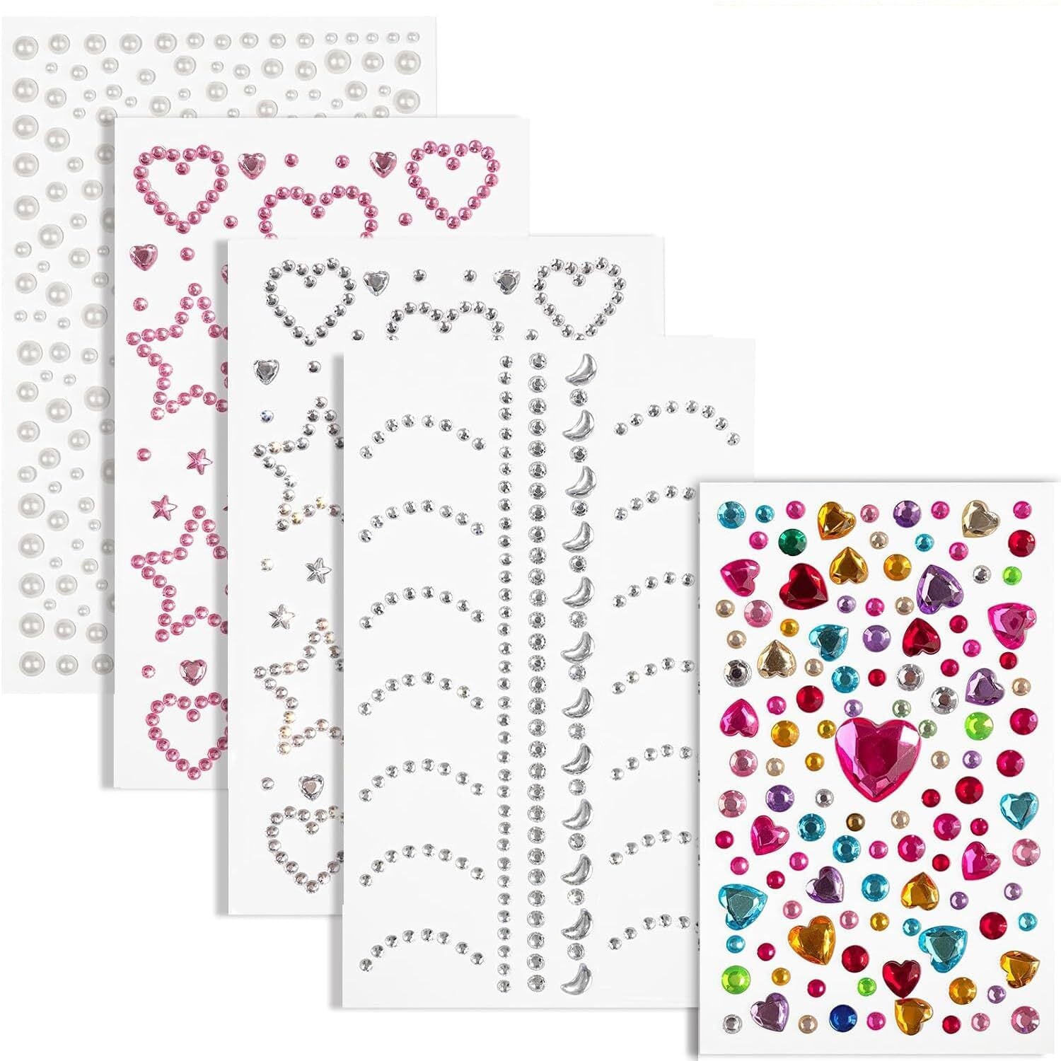 Matomtakラインストーンフェイスシール 顔 シール 5枚 クリスタル 3D パール カラフルなフェイスステッカー 光る ラインストーン デコ星 月 ハート型 デコパーツ 貼り付け可能 キラキラ カラフル DIY用品