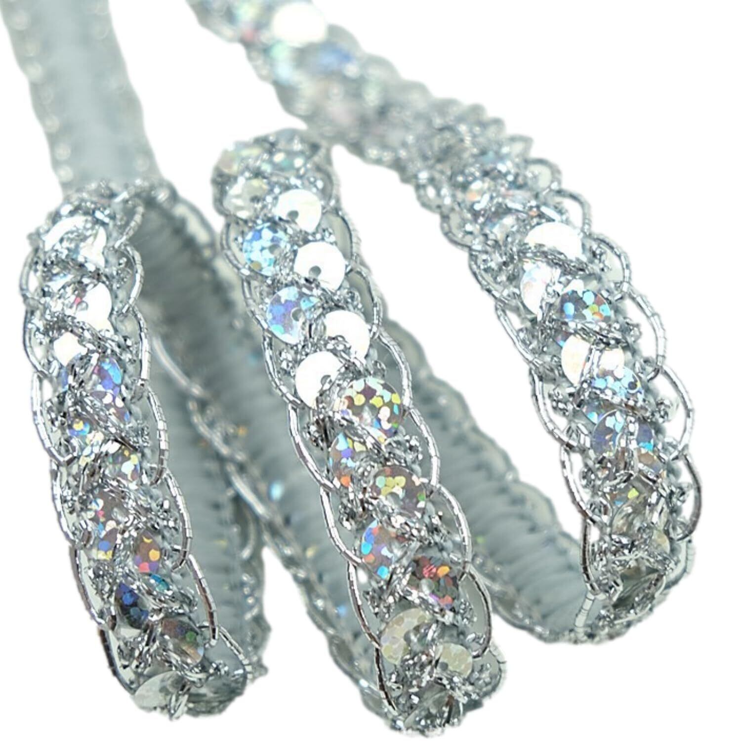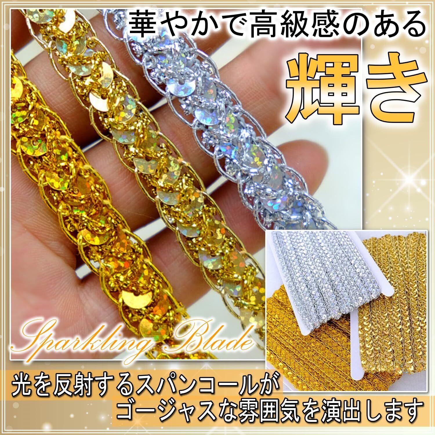編み込みにスパンコールが連なった、華やかなスパンコールブレードです。光の当たり方によって美しい光沢で、どの角度から見ても輝きが際立ちます。