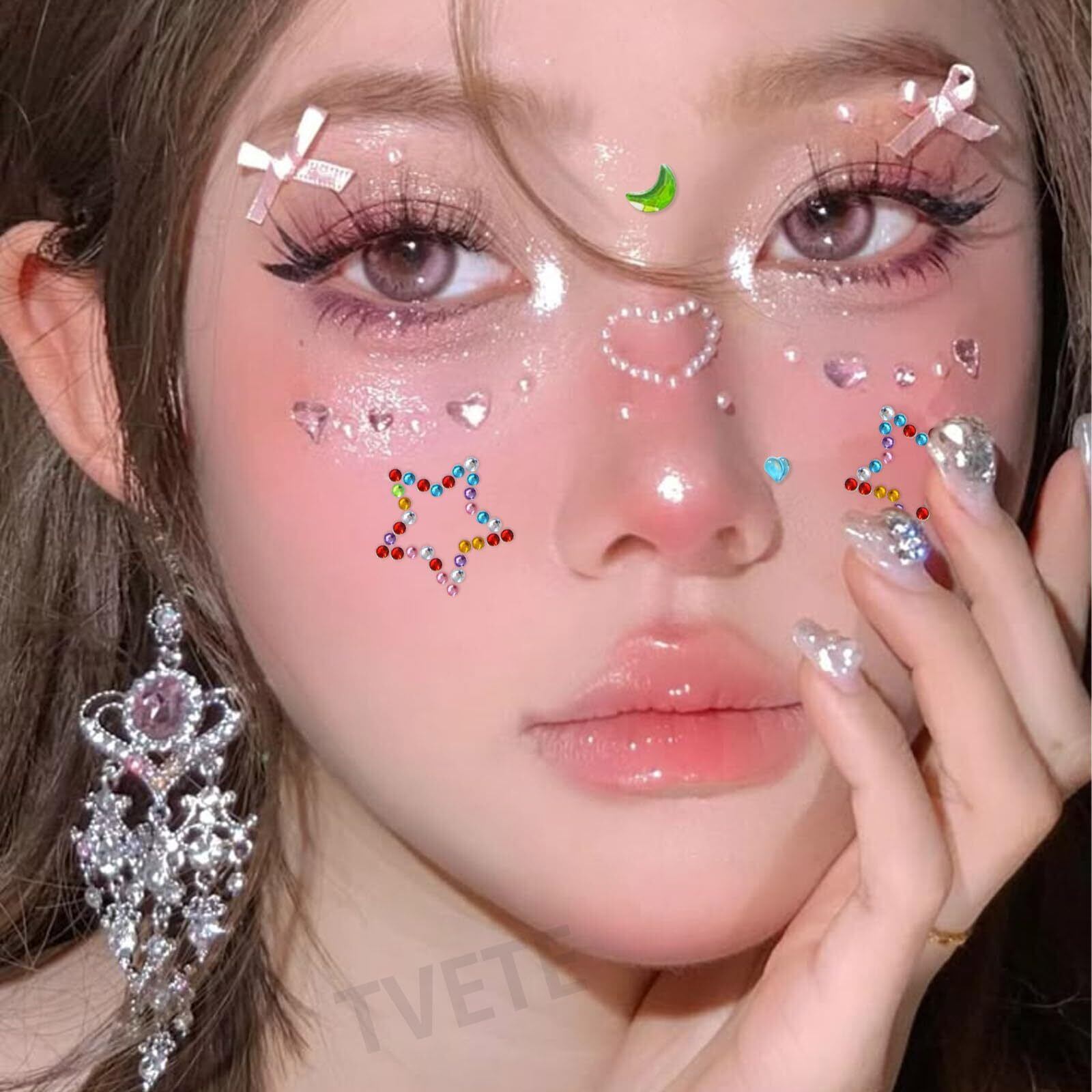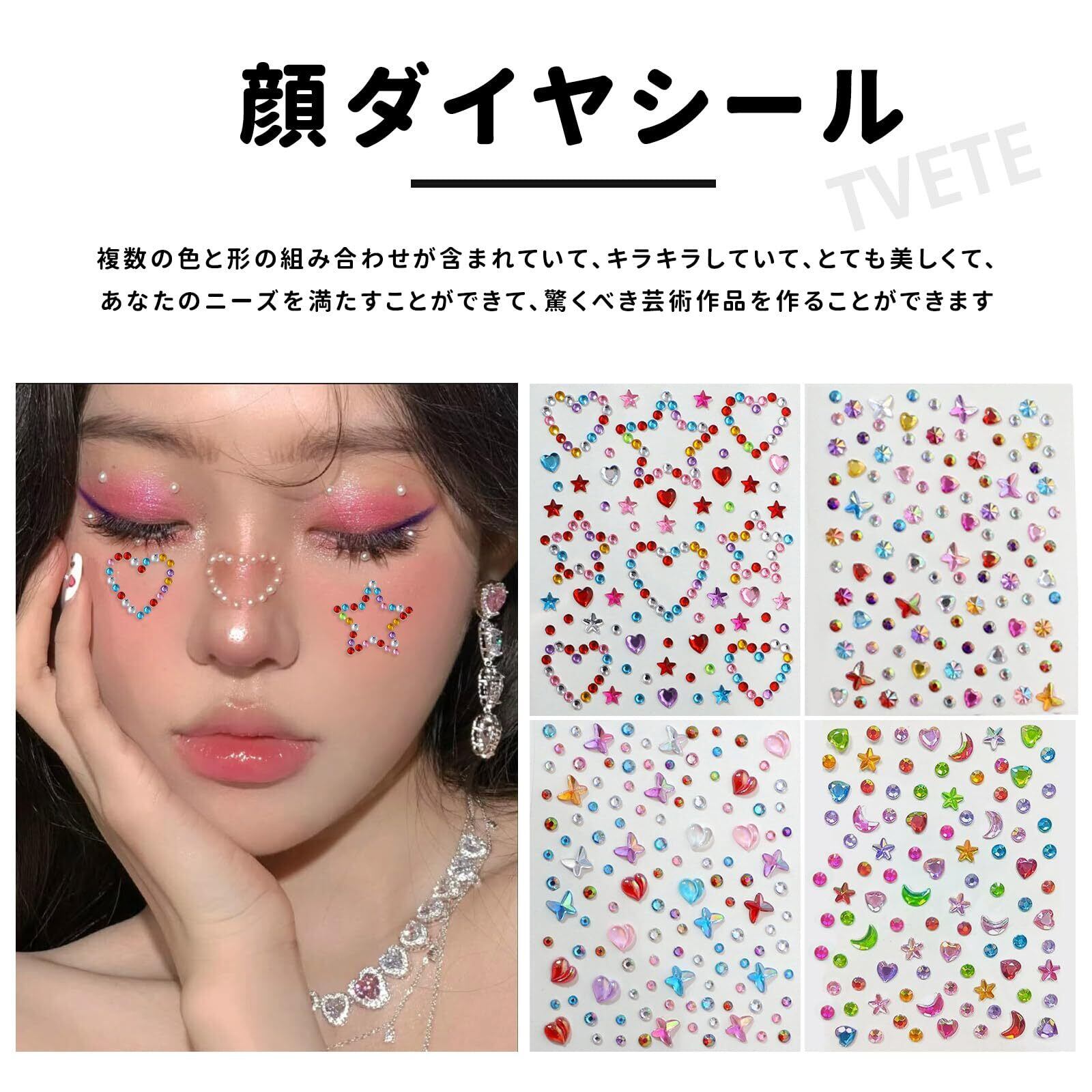 「TVETE 顔 シール」は、華やかなデザインであなたの表情を引き立てる、キラキラのラインストーンをあしらったフェイスシール4枚セットです!カラフルで立体感のあるハート、蝶、星、ドット、月のデザインは、パーティーや特別な occasions にぴったりです。