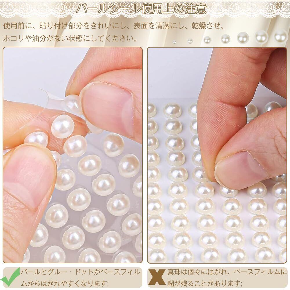 セット内容:パールシール7枚セット;商品サイズ:7サイズのパールシール、3mm 450粒、4mm/5mm/6mm 各160粒、8mm 36粒、10mm 25粒、12mm 25粒。自己吸着タイプで、ちぎってそのまま貼れる。使いやすい。注:小さな部品が含まれています、飲み込むことを避けるために子供から遠ざける。