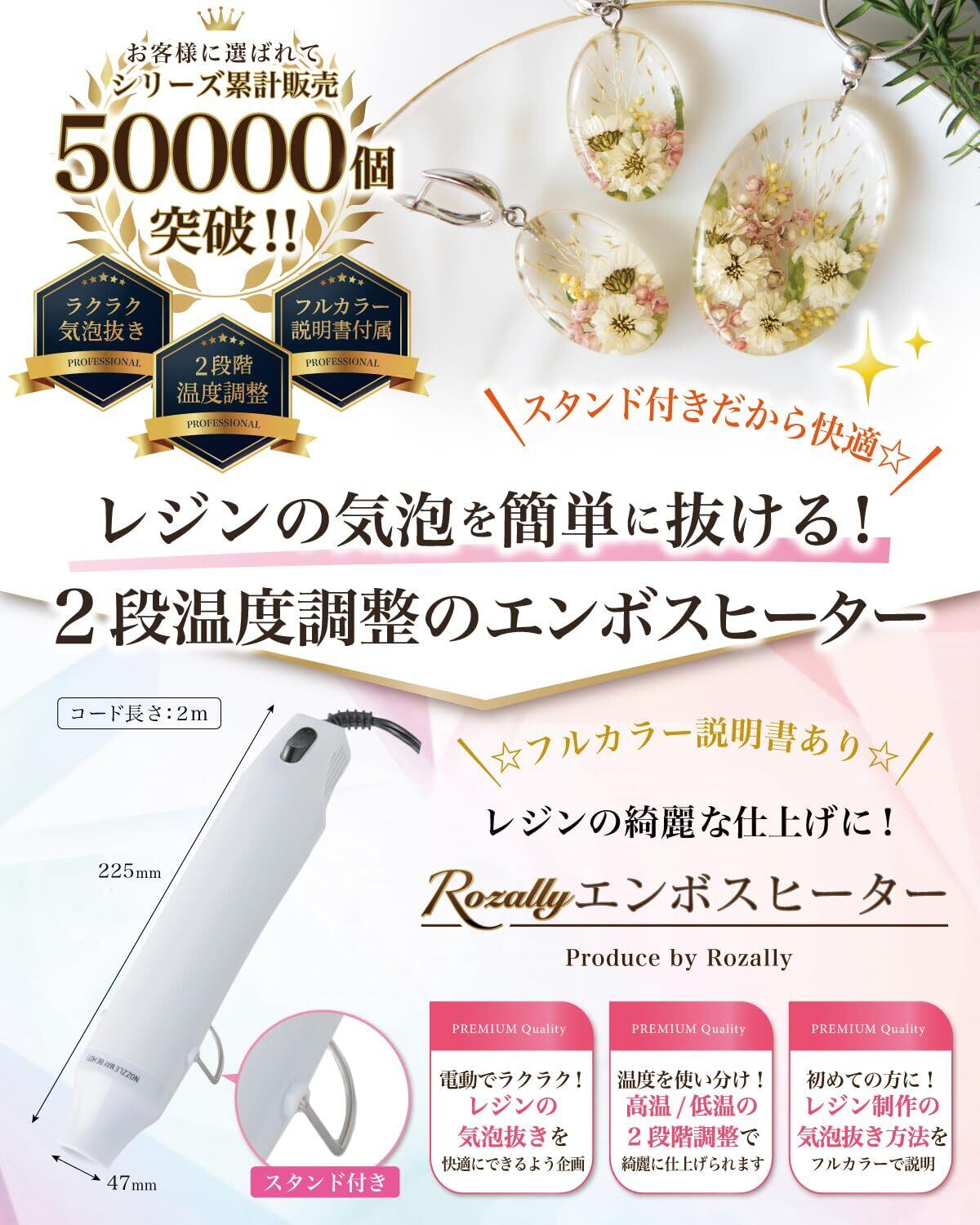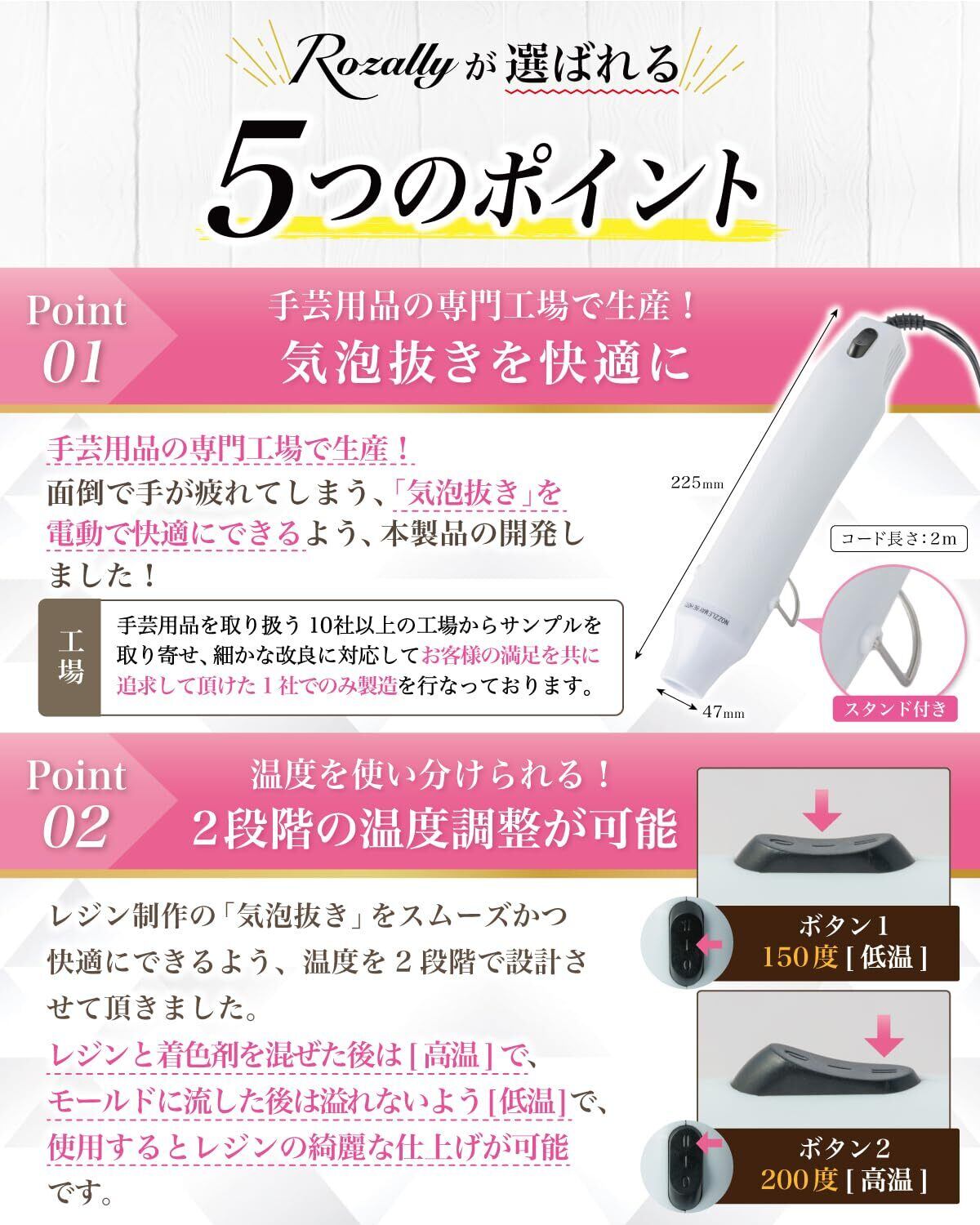 【こだわり】 様々なメーカーから レジン の 気泡 消し 用品として ” エンボスヒーター ”や” ヒートガン (ミニヒートガン) ”など 日本製/中国製など様々に販売されていますが、 Rozallyの エンボスヒーター は”こだわり”が一味違います。 「2段階の温度調整」で快適に気泡飛ばしをサポートし、 「スタンド付き/長い給電コード」で机の上で邪魔にならず使用できます。