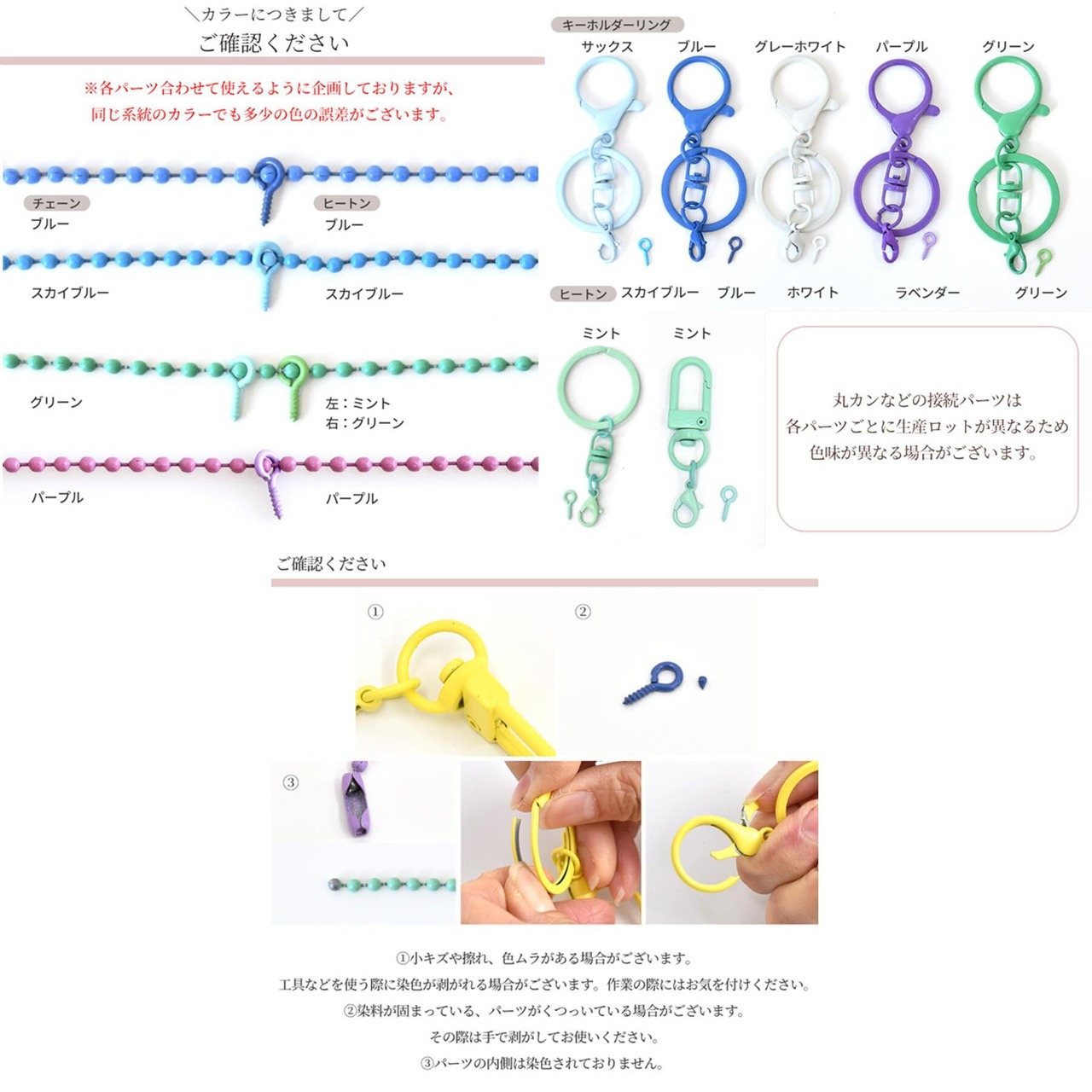 ■ご注意:・小キズや擦れ、色ムラがある場合がございます。 ・パーツの内側は染色されておりません。 ・無理に過度の力を加えると変形や破損につながる場合がございます。工具などを使う際に染色が剥がれる場合がございます。 作業の際にはお気を付けください。 ・ナスカン、丸カン、カニカン、ヒートンの色味が同じカラーでも、若干異なる場合がございます。各パーツとあわせて使えるよう企画しておりますが、多少の色の誤差がございます。