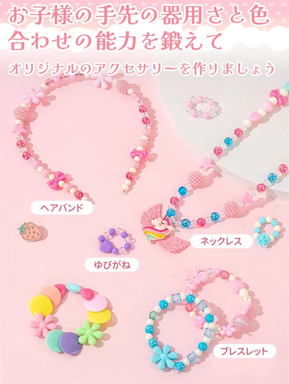 【製品の内容】:1箱入;付属8点セット:子供用安全はさみ1本、0.7 mm弾性線1巻、ストラップ1個(ランダム)、カチューシャ2個、キーホルダー6個、開口輪5個、カチューシャカバー4個、チュートリアル図面1部(中国語の取扱説明書) 【豊富な女の子 おもちゃ】ビーズ 手芸 に用いられる小さな飾り玉。アクリル製で、様々な形があり、色も多様、つないで使います。ネックレス、ブレスレット、キーホルダー、ピアス、手飾りなどに最適です。おしゃれ心が芽生えだす女の子にとって魅力的な、かわいいオリジナルのアクセサリーを作りましょう!6歳以上の子供に適用しています。 【カラフルなビーズおもちゃ】カラフルなビーズが入っているので、子供は遊びながら集中力や色彩力も養えます。また、お子様の想像力や思考力、発想力、創造力を育みます。親子で楽しめるので、家族のコミュニケーションにも役立つことがあります。 【人気なプレゼント】初心者でも自分のオリジナル作品が簡単に出来るビーズセットです。カチューシャのストッパーはついています。一緒にかわいいオリジナルアクセサリーを作り、楽しい親子時間を過ごせます。お祭り、縁日、誕生会、学校のイベント、お祝い事、クリスマスなど様々なシーンで大活躍! 【収納にも便利】便利な収納ケース付き、アクセサリーを作りたい時に簡単に持ち出し、遊んだ後はすべてケースに入れれば、簡単にお片づけができます。子供の収納意識を高めるだけでなく、省スペースでパーツの紛失も防ぎます。