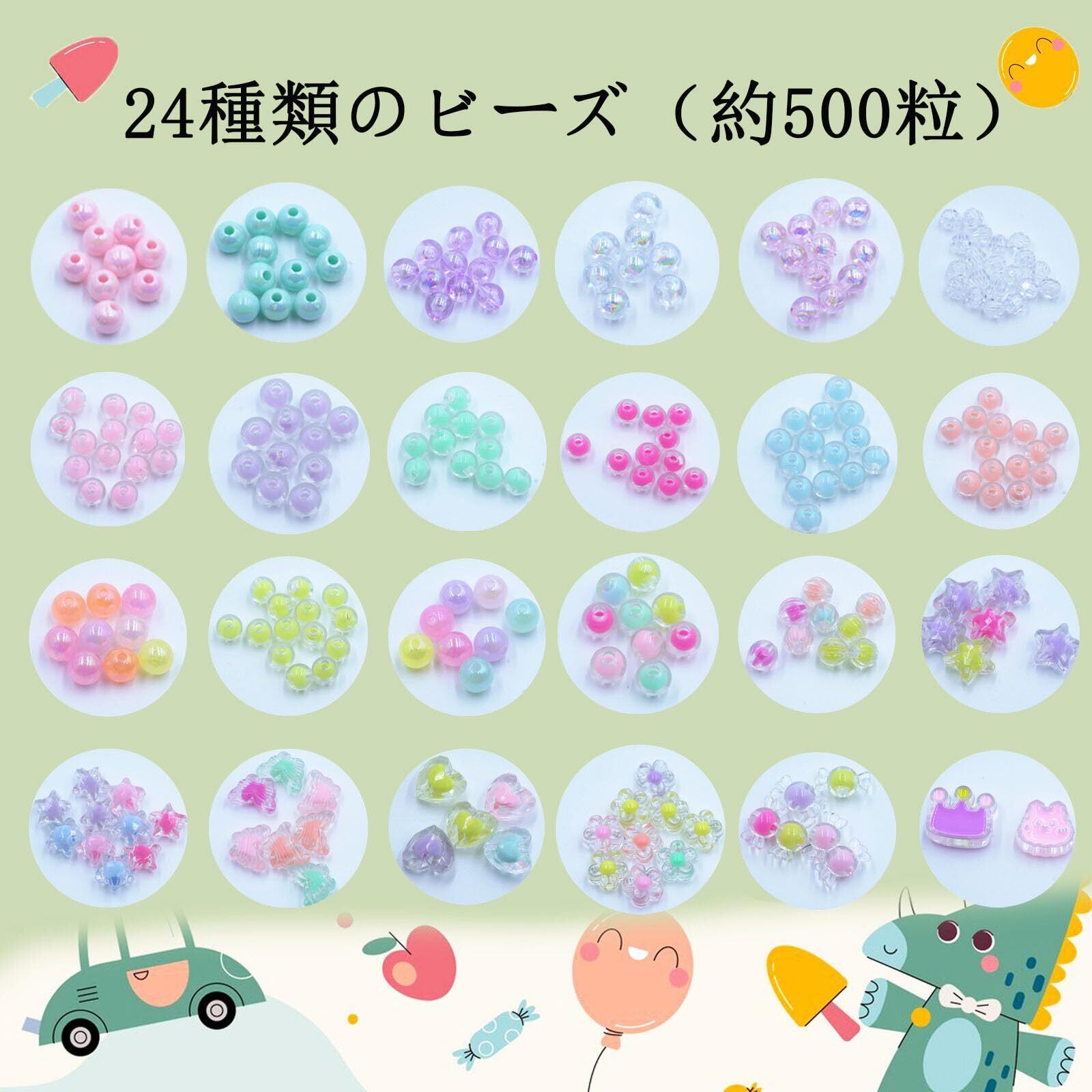 24種類500ピース以上DIYビーズセット カラフルなビーズ500個以上、安全ハサミ、ゴム紐、ストラップ、ヘアバンド、鈴など豊富なパーツ付き。収納ボックス付きで、子供や初心者でも簡単にオリジナルアクセサリーが作れます。