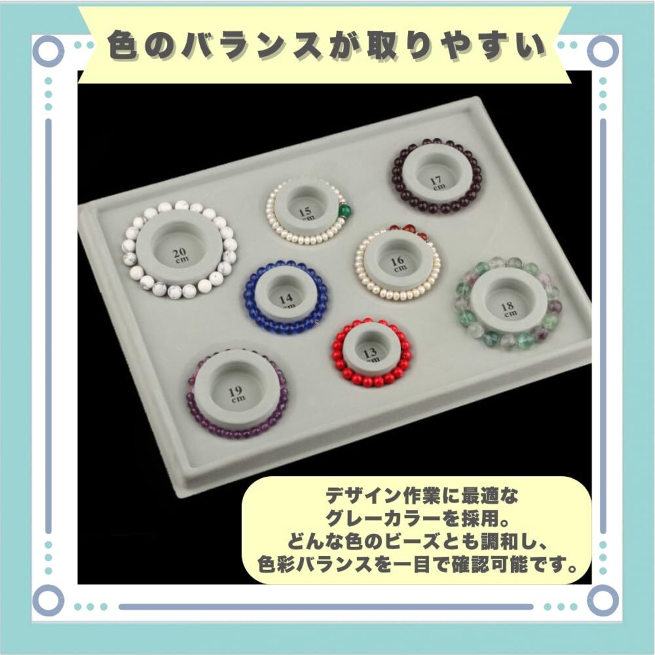 【作業効率アップ】ビーズが散らばらない設計で作業が快適に!ビーズ制作キットで、スムーズなアクセサリー作りをサポートします。【イメージがしやすい】アクセサリーのサイズ感や配置バランスが簡単にイメージでき、デザイン作業がよりスムーズに行えます。初心者からプロまで満足の機能性です。【手首サイズにフィット】様々な手首サイズに対応し、贈り物や自分用にもぴったりなブレスレットを作ることができます。【色のバランスが取りやすい】デザイン作業に最適なグレーカラーを採用。どんな色のビーズとも調和し、色彩バランスを一目で確認可能です。