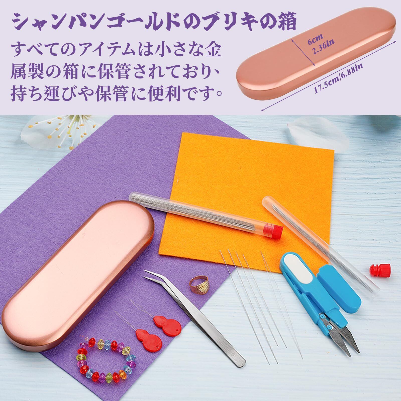 ビーズ針セット:ビーズ針セットには、長いストレートビーズ糸針75本、ビッグアイニードルビーズ18本、ゴールドシンブル1本、針ボトル2本(ランダムカラー)、針2本が含まれます