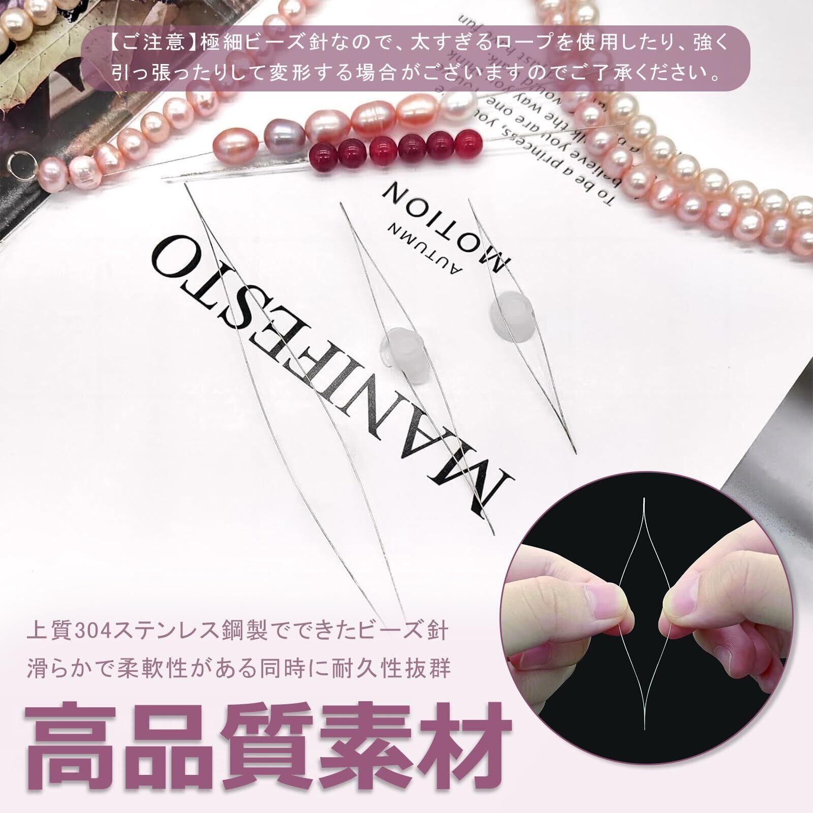 【高品質素材】上質な304ステンレス鋼で作られたビーズ針は金属光沢を備えている同時に、耐久性があり、耐腐食性に優れています。滑らかで柔軟性があり、錆びにくく長期間使用可能です。【ご注意】※極細ビーズ針なので、使用時に太すぎるロープを使用したり、強く引っ張ったりすることで変形する場合がございますのでご了承ください。