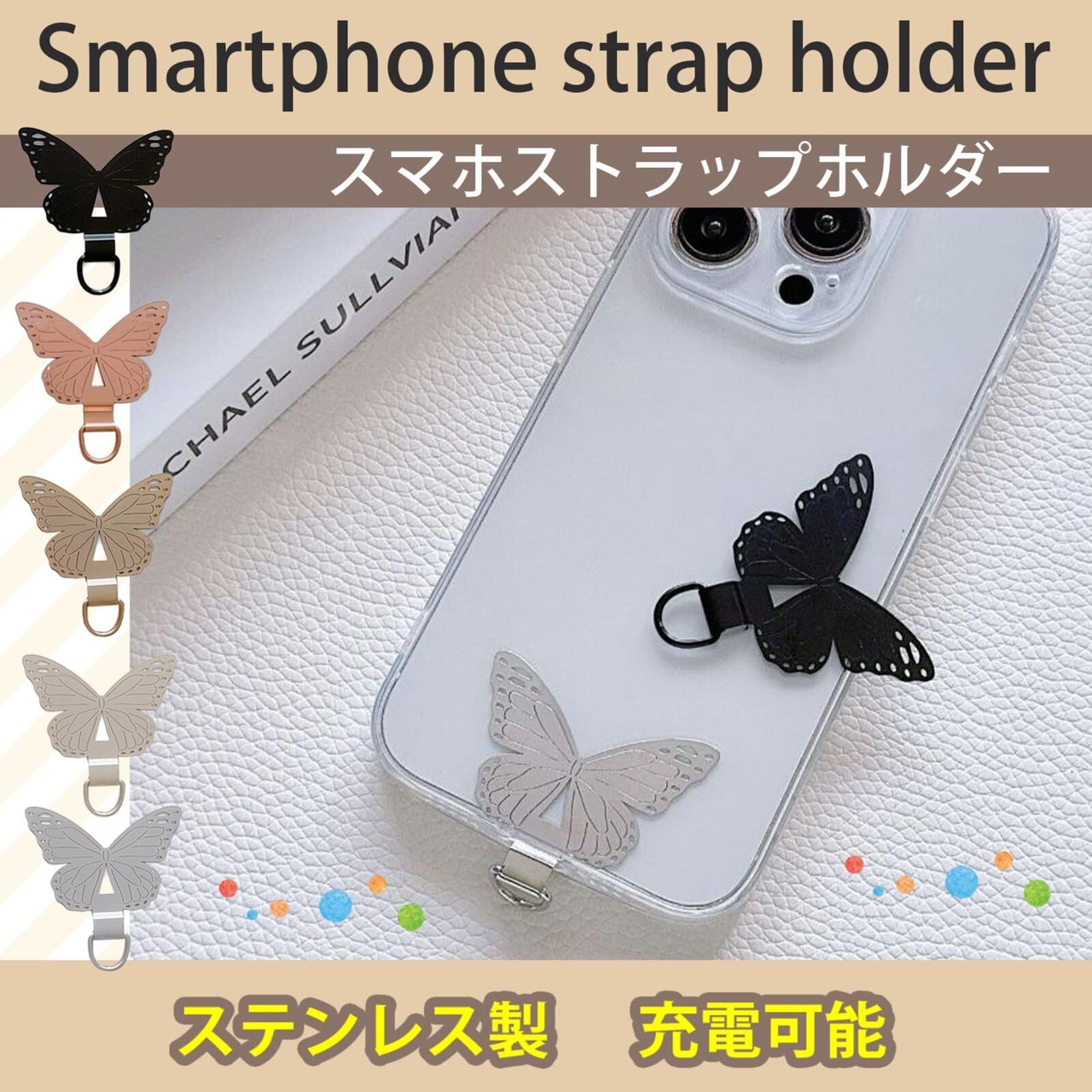 かわいい蝶のストラップホルダー:スマホ本体とケースの間にホルダーを挟むだけで、ショルダーになります。どーせ接着部分が見えるなら、かわいくしたい!という方にオススメ。クリアケースの時、蝶が見えるとかわいいですよね! カラーは、ブラック・シルバー・ピンクゴールド・ゴールドおよび5色セットがございます。 ステンレス製:くすみや錆もなくて綺麗なステンレス製です。丈夫なので末永くお使い頂けます。 つけたままでも充電可能:ストラップホルダーをつけたままでも充電ができますので、わざわざ取り外す必要もなく便利です。 使用方法:①コの字を下向きにして充電口から入れる ②反対向きにしてスマホをはめ込む ③ホルダーのDカンにストラップを取り付けて完成です。 サイズ:サイズは、4.5cm×4cm。存在感のある蝶がワンポイントになります。推しのトレカと一緒に挟んでもかわいいですね!