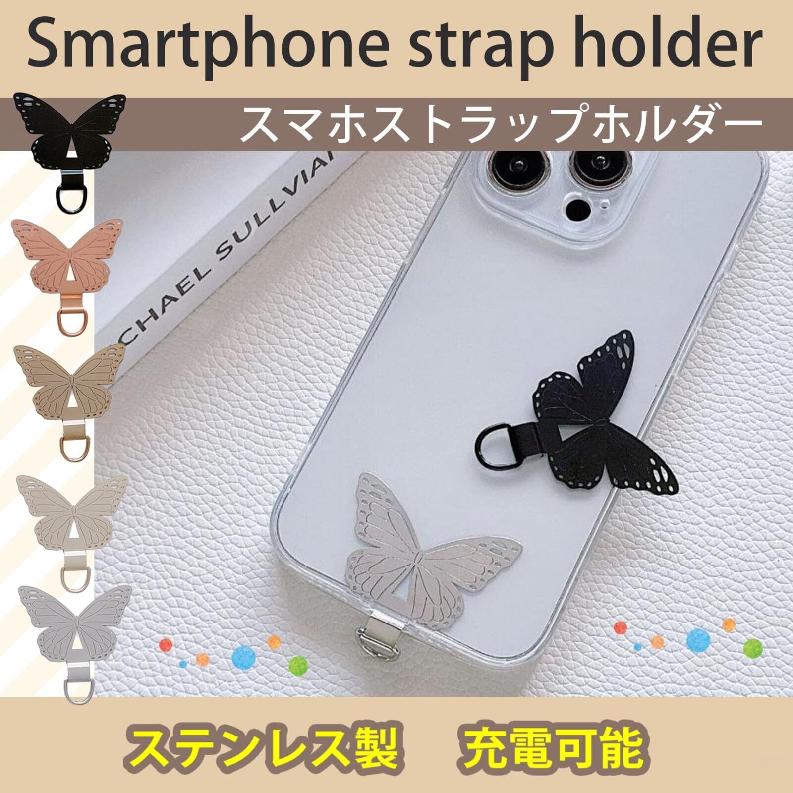 かわいい蝶のストラップホルダー:スマホ本体とケースの間にホルダーを挟むだけで、ショルダーになります。どーせ接着部分が見えるなら、かわいくしたい!という方にオススメ。クリアケースの時、蝶が見えるとかわいいですよね!
