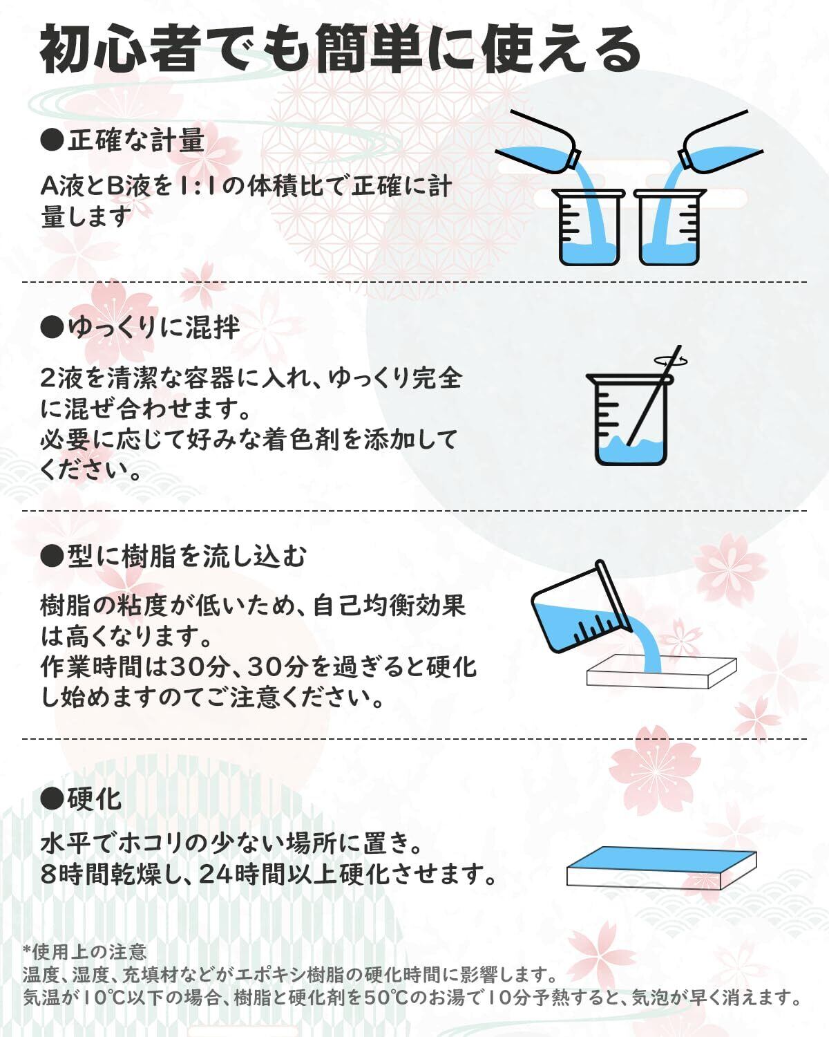 【自然脱泡性&自然硬化】低粘度のエポキシ樹脂なので、気泡が少なく、撹拌後3-5分放置することで自然に気泡が消えます。UVレジン液とは異なり、紫外線に曝す必要はなく、特殊な工具や機械を必要とせず、時間とともに硬化します。