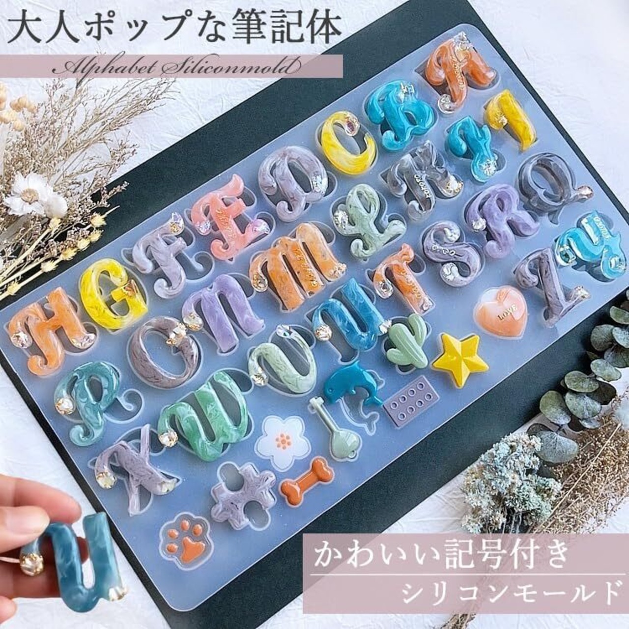 【商品について】大人かわいい筆記体のアルファベットが作れるシリコンモールドです。イニシャルキーホルダーやバックチャーム作りに最適です。イルカやブロック、パズル、鍵、桜、肉球などのかわいい形も揃っていて、アレンジが沢山思いつく楽しいモールドです 柔らかく丈夫な良質なので、取り出しやすく使いやすいモールドです。UVレジン、エポキシ樹脂、樹脂粘土などにご利用いただけます。