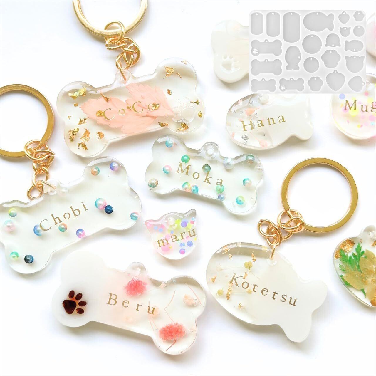 ペット名札のレジンシリコンモールド型嬉しい金具付き!骨・魚・猫・犬・ハート・丸・肉球・タグ など可愛いモチーフがたくさんオリジナルキーホルダーを手作りしよう! シリコン型は半透明ですが通常のものよりもやや白っぽいため、濃い色の着色を行う際には長めの硬化をおすすめします。