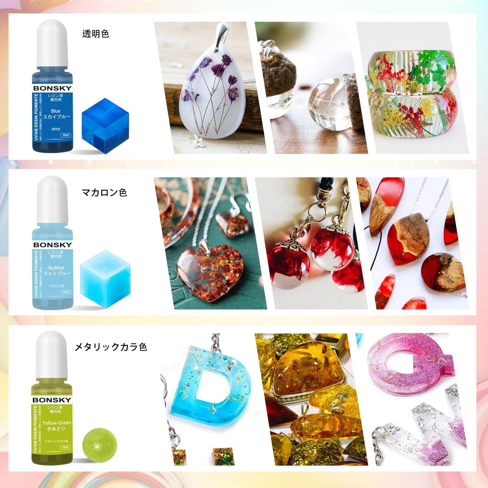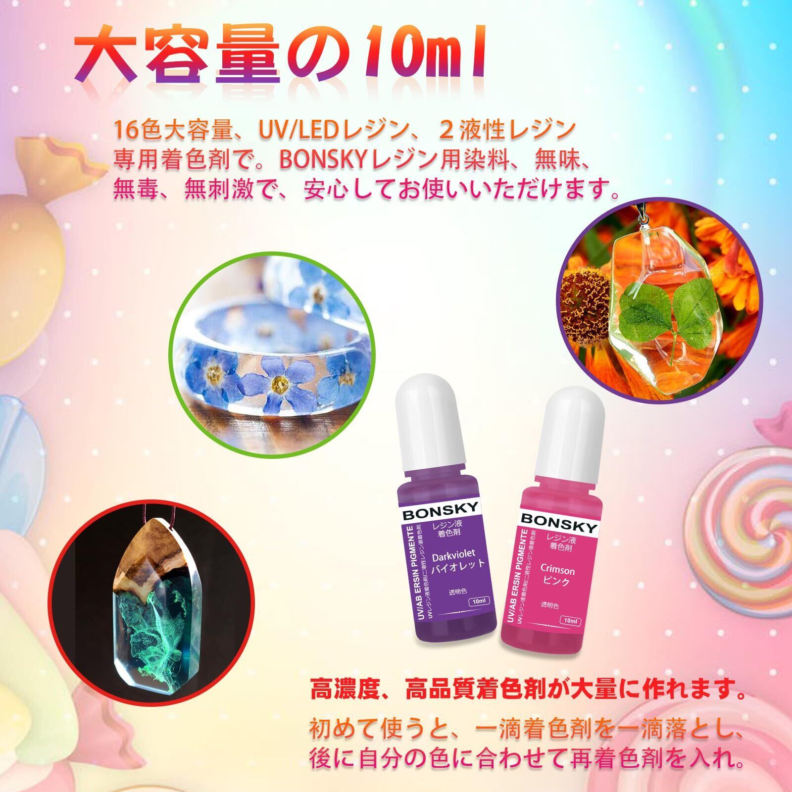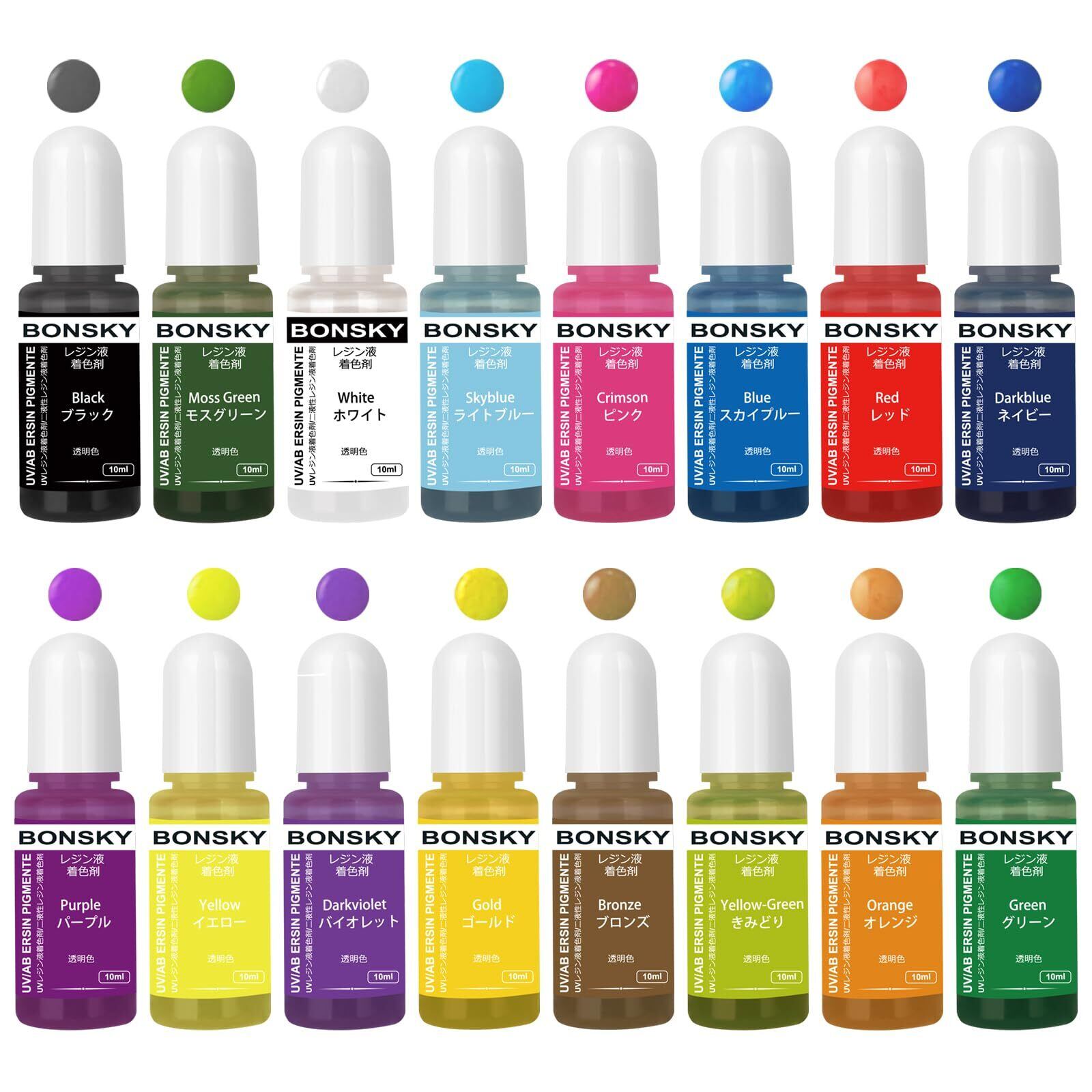 レジン着色剤16色*10mlセット:16色高品質な染料を使用しているため、色あせや退色の心配がありません。UV/LEDレジン、2液性レジン専用着色剤で。Bonskyレジン用染料、無味、無毒、無刺激で、安心してお使いいただけます。Bonskyレジン液と一緒に使うと効果がより良いです。