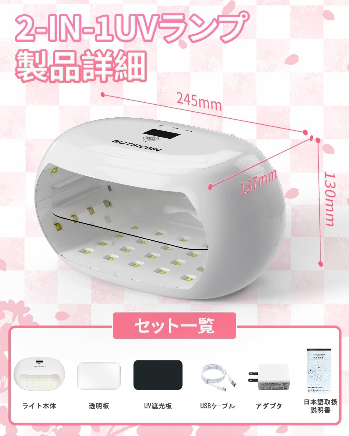 【在庫処分】BUTIRESIN【60W 超強力 UVランプ】UV レジン ライト 2in1 - 両面照射、360度光源60W、長時間タイマー設定(60秒・180秒・300秒)、56個のLED搭載、長時間タイマー設定、LED表示画面付き、DIYクラフト レジン専用ライト (白) | wakuwakuland