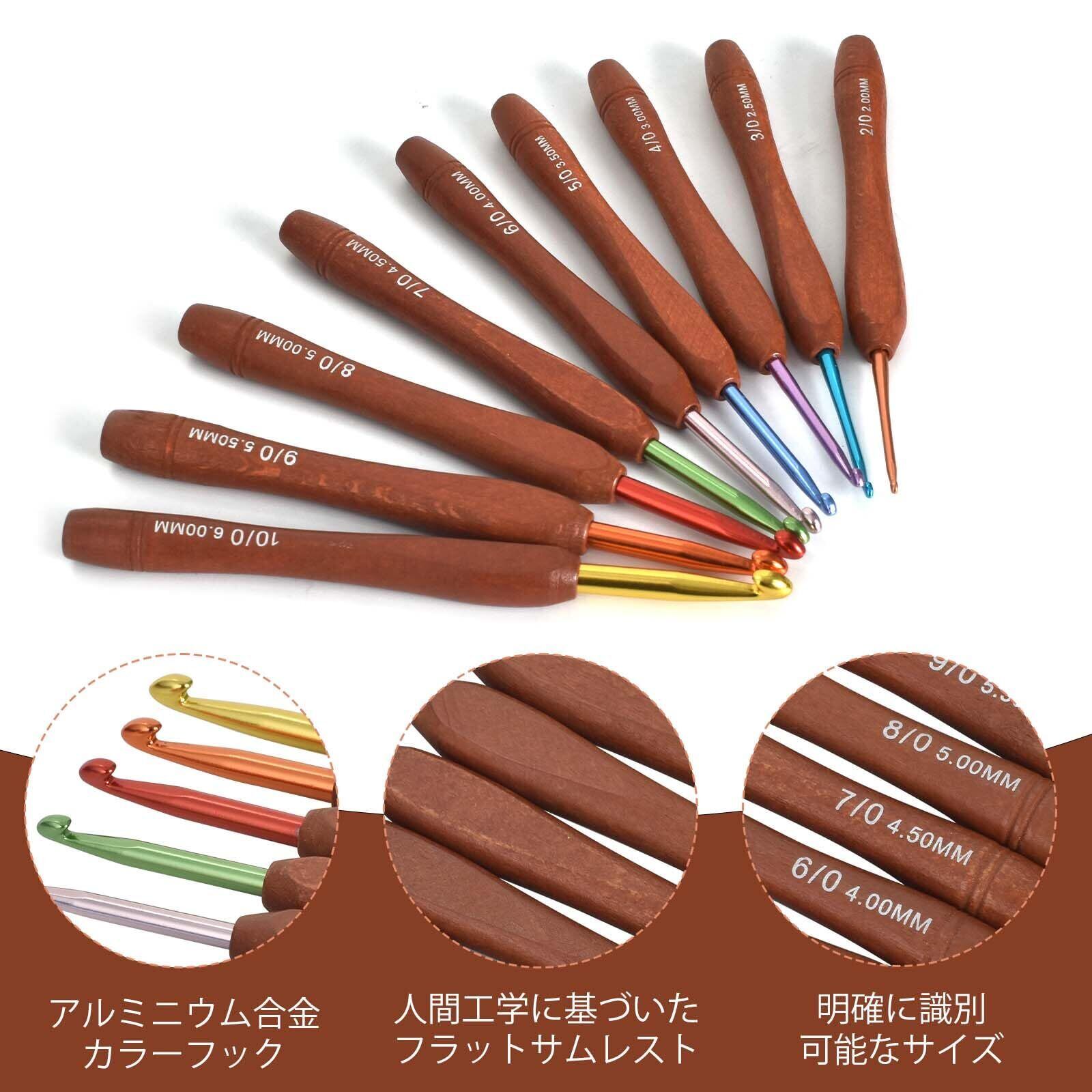 ・【人間工学に基づいたデザイン!】: 手に優しい木製ハンドルが特徴で、長時間の編み物でも疲れにくい設計です!滑り止め加工により、安定感も抜群です。