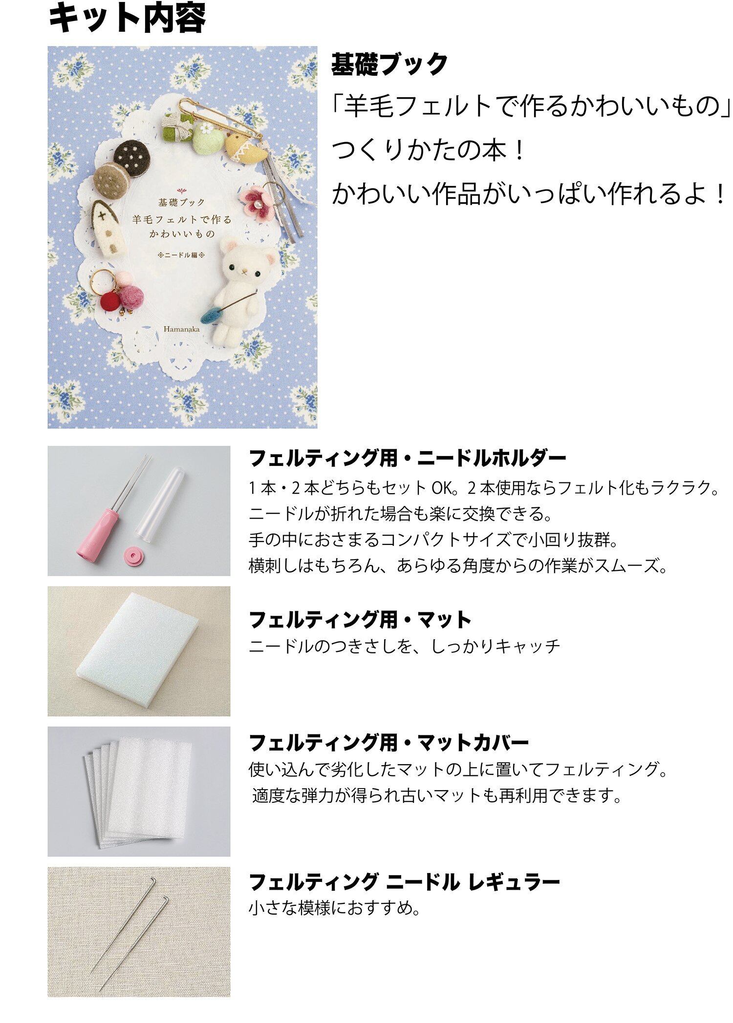 セット内容:フェルティングニードルレギュラー(1本タイプ)×2本、フェルティング用マット×1枚、フェルティング用マットカバー×2枚、取扱い説明書、基礎ブック(羊毛フェルトで作るかわいいものニードル編)