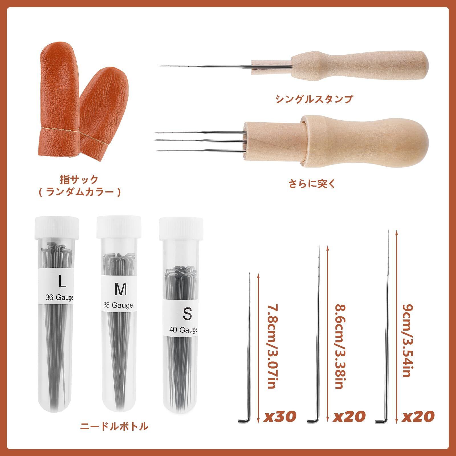 羊毛フェルトツールキット:羊毛フェルトニードルツールは箱に入っています。3つの異なるサイズの針、細い針30本、中針20本、太い針20本、針ツール2本、指サック1組(ランダムカラー)が含まれています。 3×ニードルボトルでさまざまなニーズにお応えします