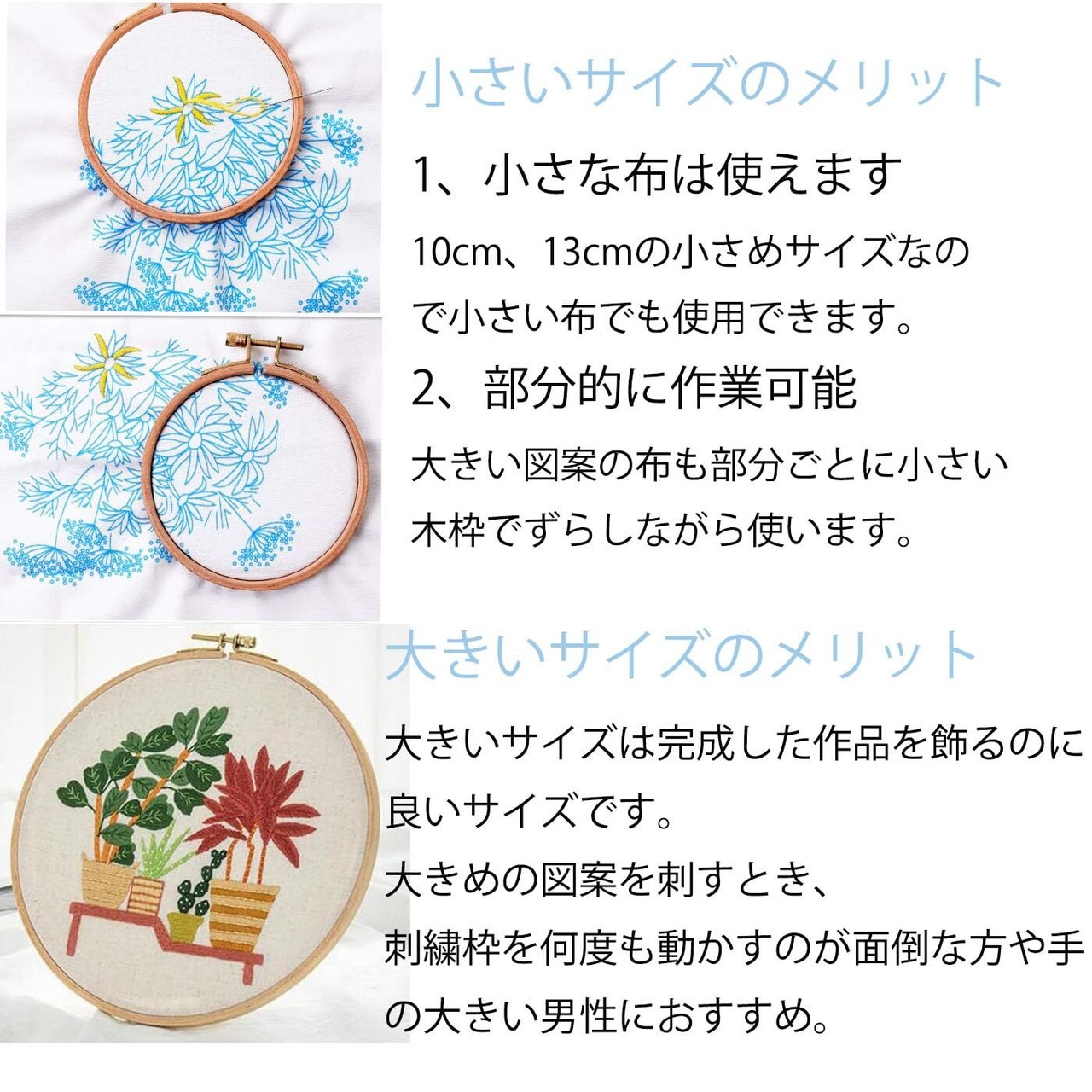 【3種類のサイズで使い勝手抜群】 3種類の異なるサイズが 1 セットになっており、刺繍教室やワークショップでの活用に最適です。小型でコンパクトなデザインのため、バッグに入れて持ち運びも容易。短い空き時間でも気軽に刺繍作業が始められます。