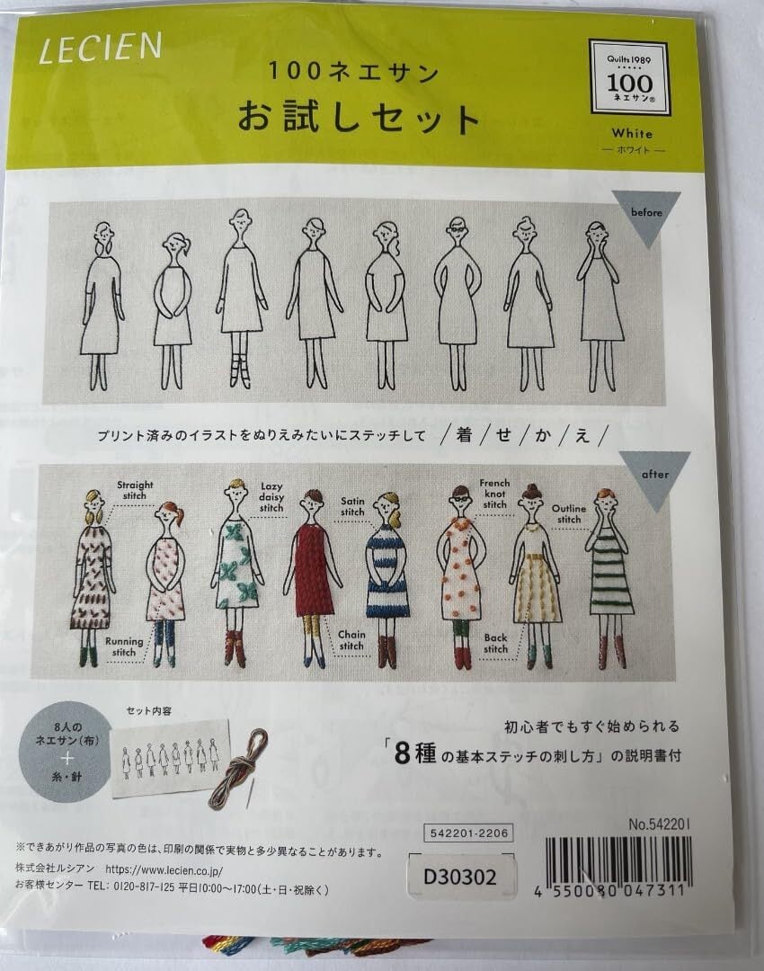 セット内容の布には、8人のネエサンがプリントされています。「8種の基本のステッチの刺し方」の説明書付きなので、初心者の方でもすぐに始められます。