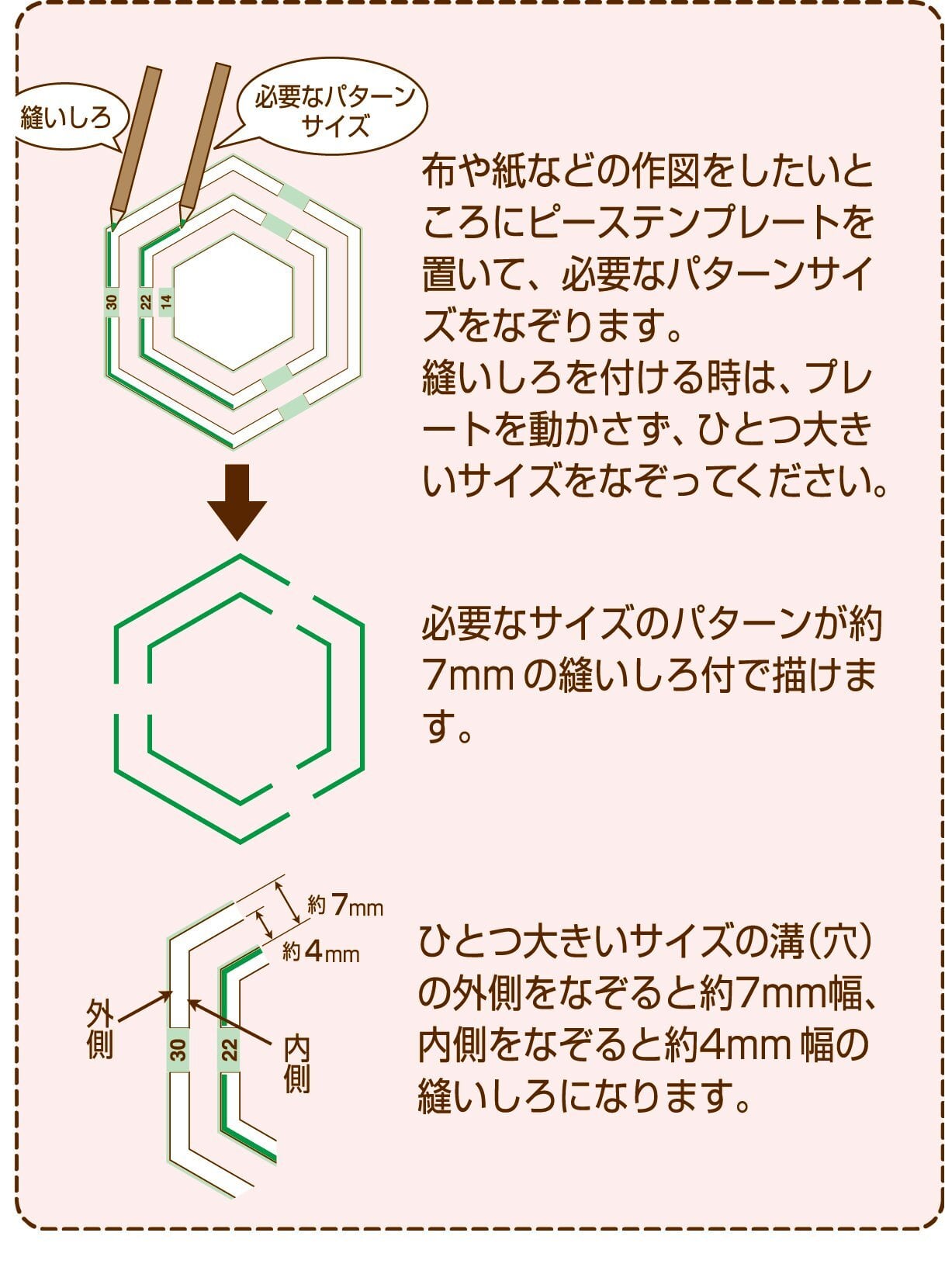 布や紙などの作図をしたいところにピーステンプレートを置いて、必要なパターンサイズをなぞります。