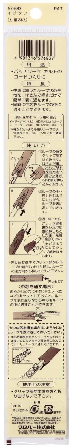 「Clover イージーターン 2本組」は、生地を簡単に表に返すのに役立つ便利なアイテムです。特に細いループや曲線に最適なデザインで、手芸やミシン製作がよりスムーズに行えます。これで、制作時間を短縮し、精細な作品作りをサポートします。
