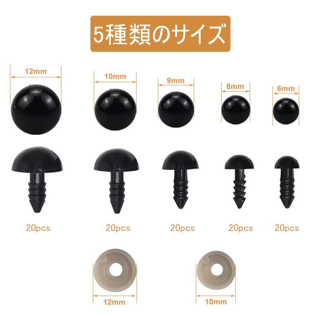 ぬいぐるみの目 100個入り 6mm/8mm/9mm/10mm/12mm 動物 人形目 パーツ 丸型 手芸用さし目 黒目ドールメイキング さし鼻 動物鼻 DIY縫製 手作り