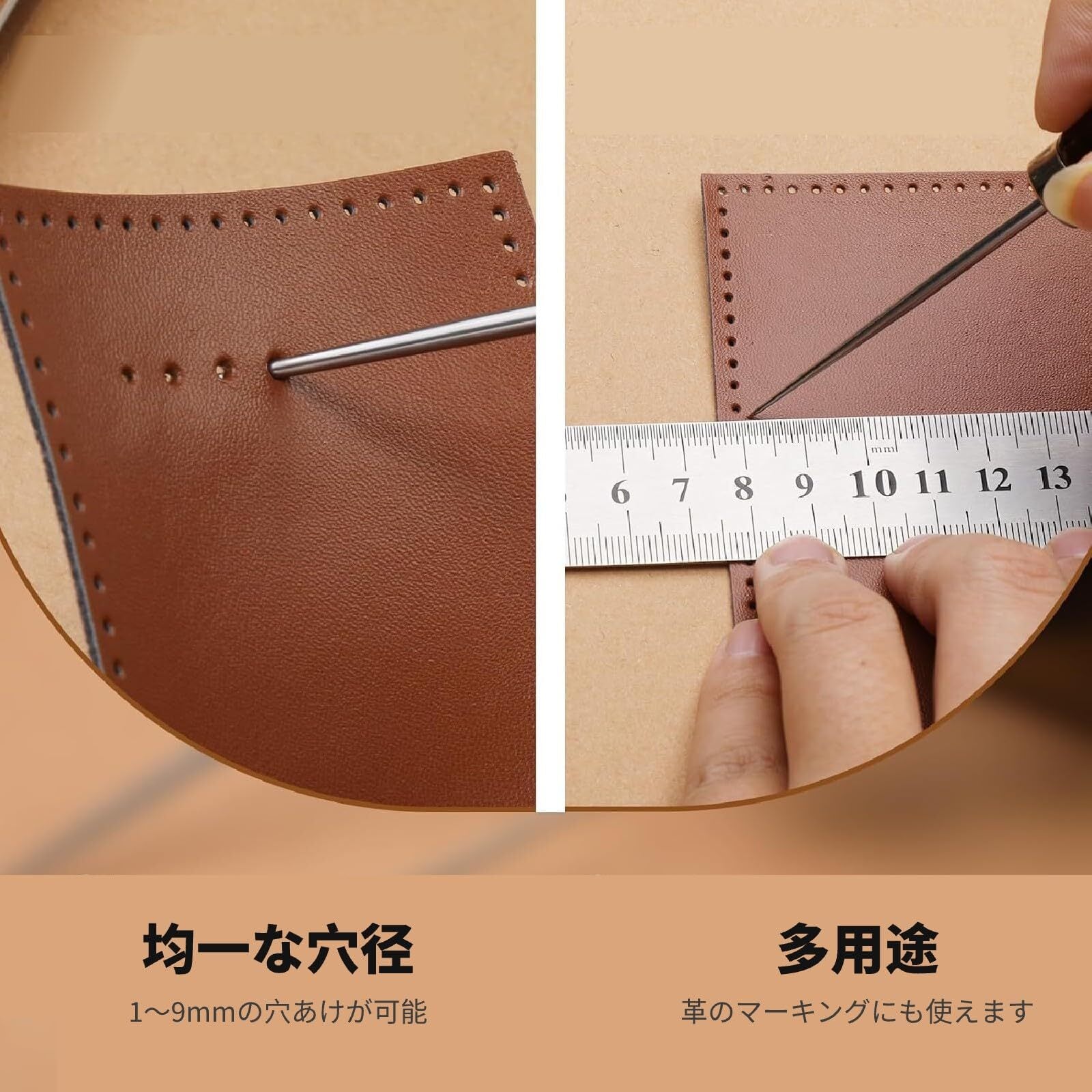 ・【高耐久材質】: ステンレス製の本体は、耐久性が高く長持ちします。鋭利な切れ味と強固な造りで、力を入れなくてもスムーズに革を貫通させることができます。