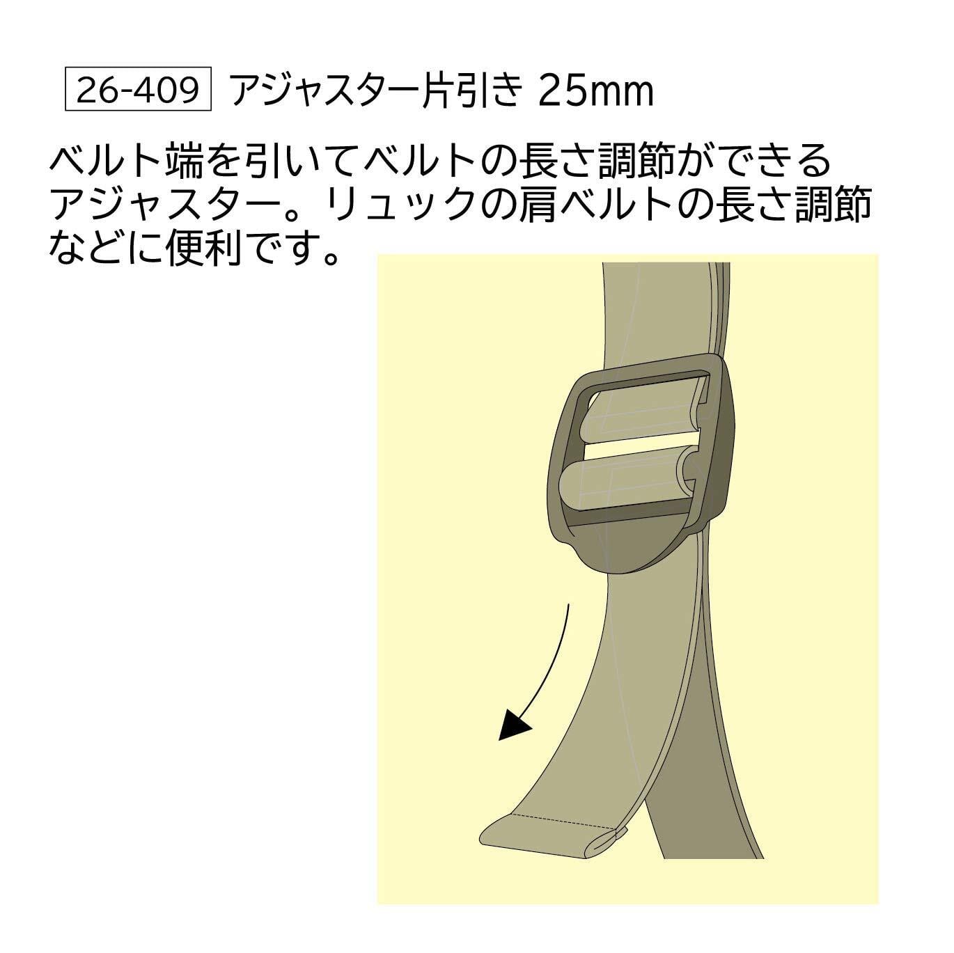 ベルトを引いて長さ調節。丈夫な樹脂製、25mm幅のベルト用片引きアジャスターです。薄くフラットで操作しやすい形。ベルトの端を引いてベルトの長さを調節し、好みのサイズにできます。リュックの肩ベルトの長さ調節などに便利です。