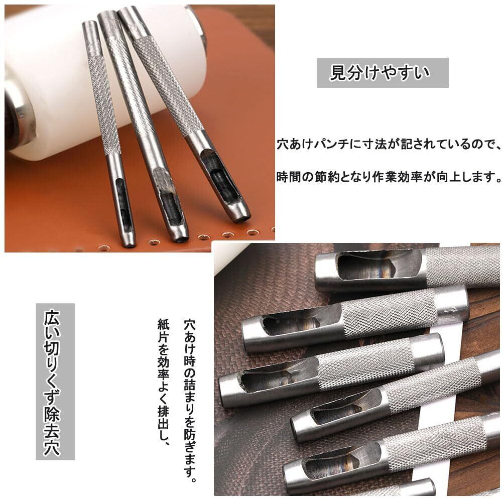 ・【多様な穴サイズ】: このポンチセットには、異なるサイズの穴あけができる6種類のサイズが含まれています!ベルト、財布、腕時計など、さまざまなレザーアイテムに適用可能です。