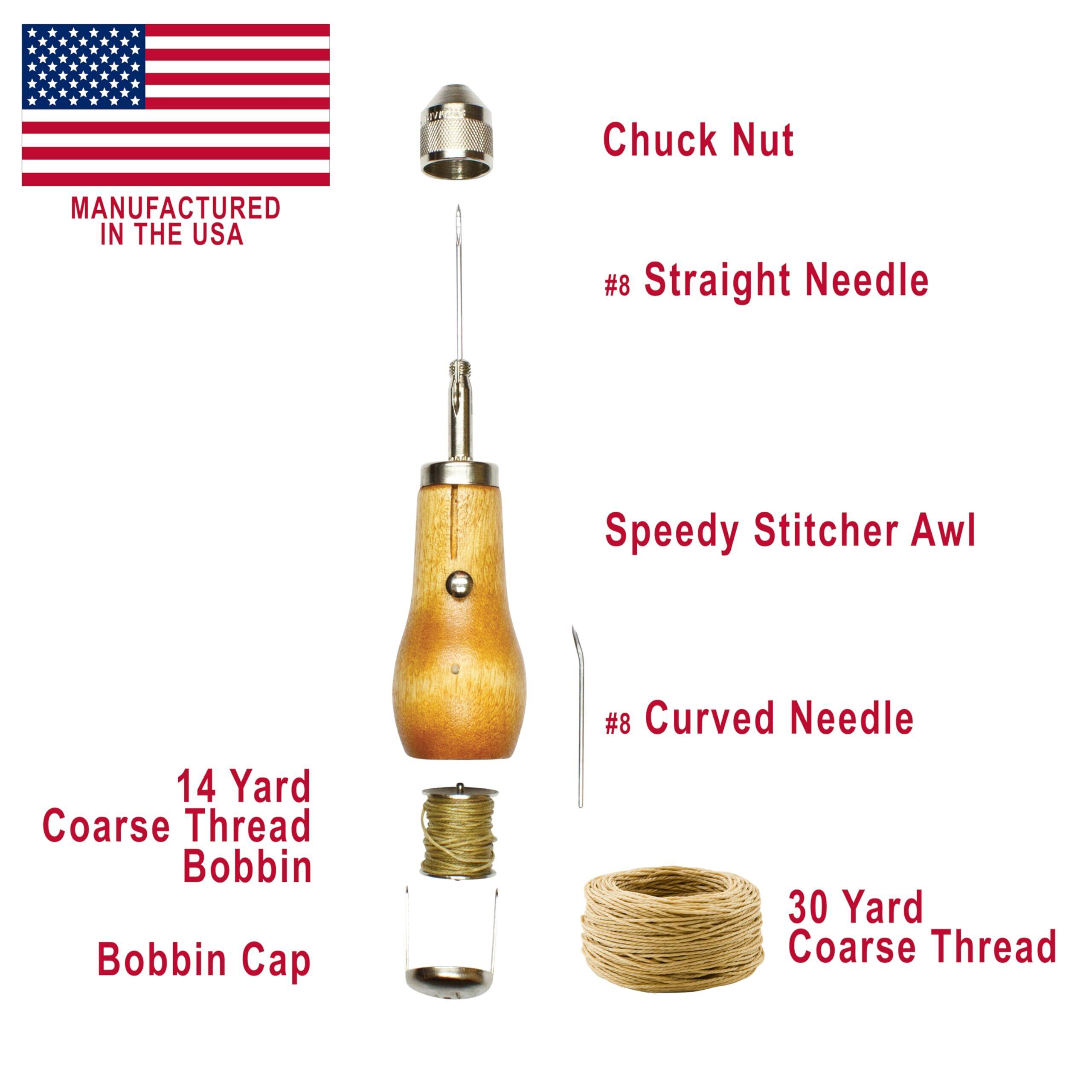 The Speedy Stitcher can be used to sew any heavy material. A handy tool to have around the house, farm, or any place where heavy material has to be sewn. Contains: Speedy Stitcher Sewing Awl, Straight Needle, Curved Needle, Bobbin of Coarse Thread and Easy-to-Follow Instructions.