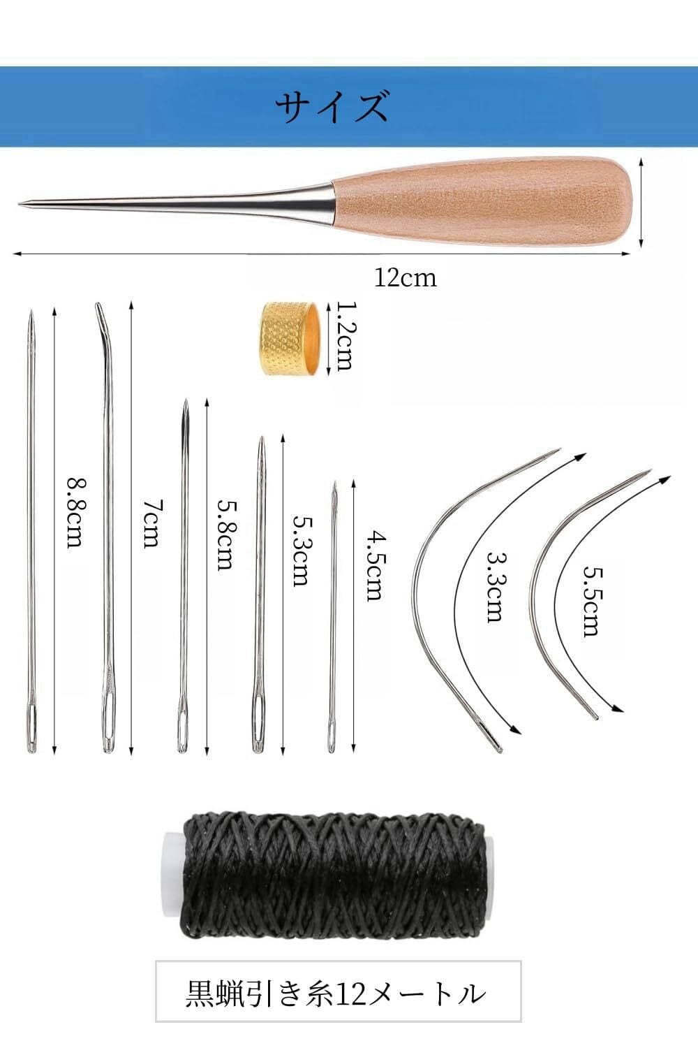 【パッケージ内容】計10点セット。手縫い針*5、湾曲針*2、千枚通し*1、指ぬき*1、蝋引き糸*1。