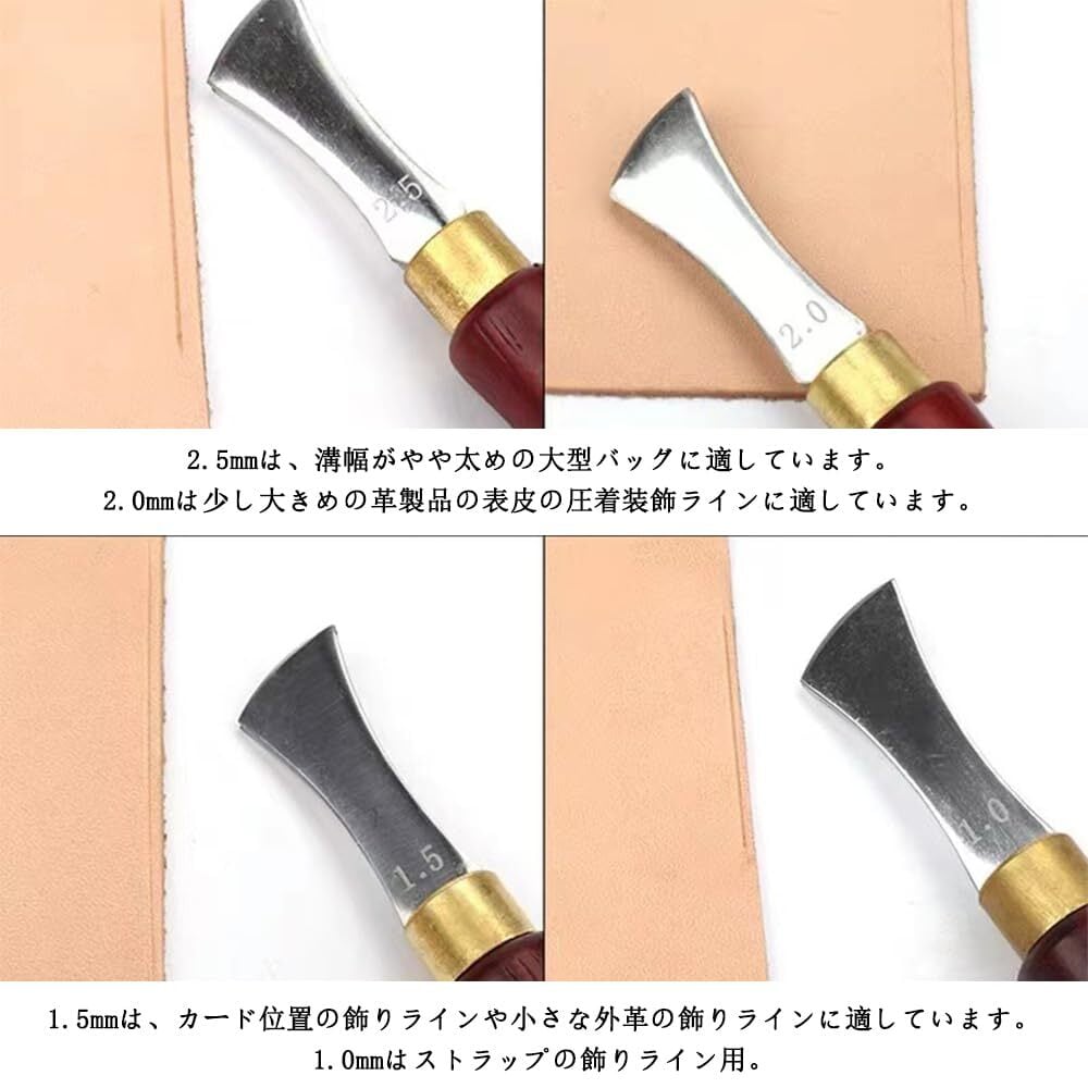 1.【製品内容】:レザークラフト用の革包丁1個セットです。 2.【商品仕様】:刃先の幅:2mm、長さ:155mm。 3.【独特的设计】:刀口:凹槽部分的左右两边都有牢固的阶梯,适合画线而不移位。 即使对初学者来说也很容易使用。 4.【プレミアムな仕上がり】:このツールは、無垢材のハンドルと非常に洗練されたベベルエッジで非常によく作られています。耐久性と優れた仕上がり、ハンドルを握るときの快適な手触りを提供します。 5.【用途】:アルコールランプで本商品の先を5秒程度熱します、熱する事でクッキリとしたラインに仕上げる事が出来ます、(ワックスなど塗ると仕上がりもより良くなります)。